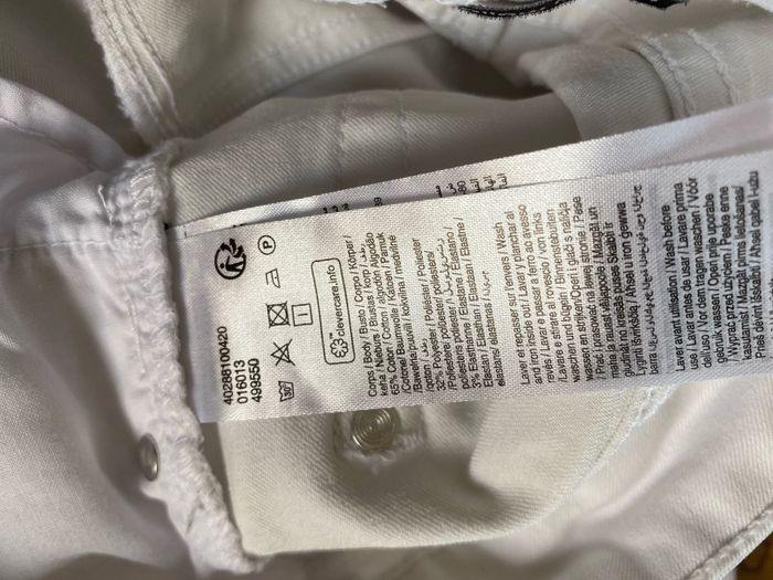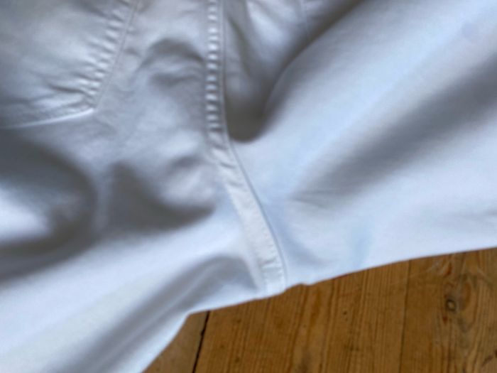 Pantalon jeans blanc skinny 65% coton 32% polyester 3% elasthane Taille 38 Follow me La ceinture mesure à plat 39 cm, va jusqu'à 44 cm en tirant Longueur milieu devant 23,5 cm Longueur entre jambe 73,3 cm Largeur à plat bas des jambes 12,2 cm
