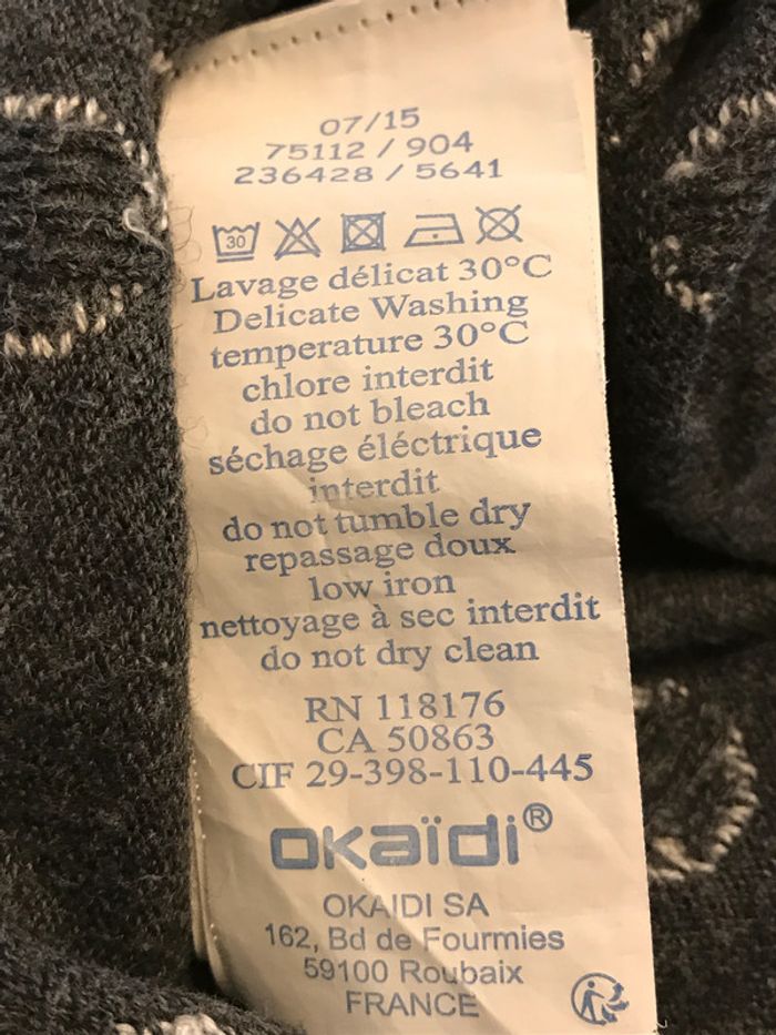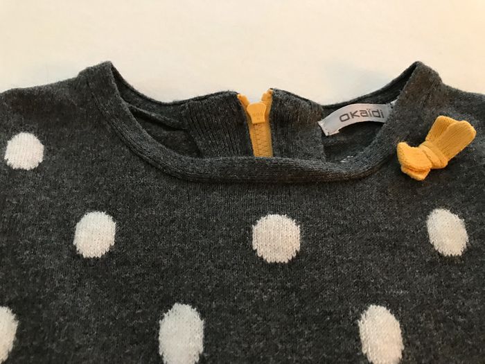 Petite robe en matière laineuse, très douce Encolure ronde avec petit nœud plat jaune moutarde Coupe ajustée sur le haut du corps et jupe froncée évasée sous la taille marquée Ouverture par zip jaune moutarde dos enfilage facile Manches courtes terminées par un bord côtes Composition : 35 % viscose, 35 % polyamide, 27% coton et 3 % laine Très bon état Taille : 6 Ans Marque : OKAID #6ansdavicl