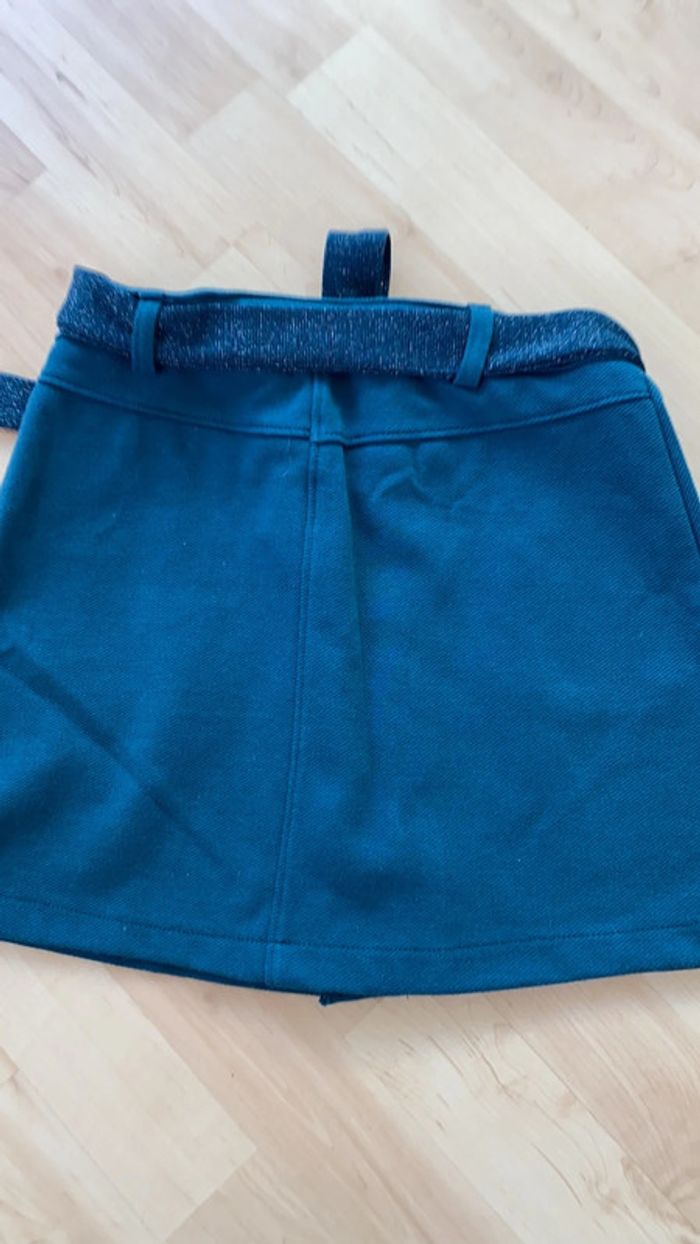 Jupe courte bleue pétrole . Boutons décoratifs sur le devant . Jolie ceinture brillante . Deux poches avant . Ajustable à la taille par des élastiques . Excellent état . Marque okaidi 10nov