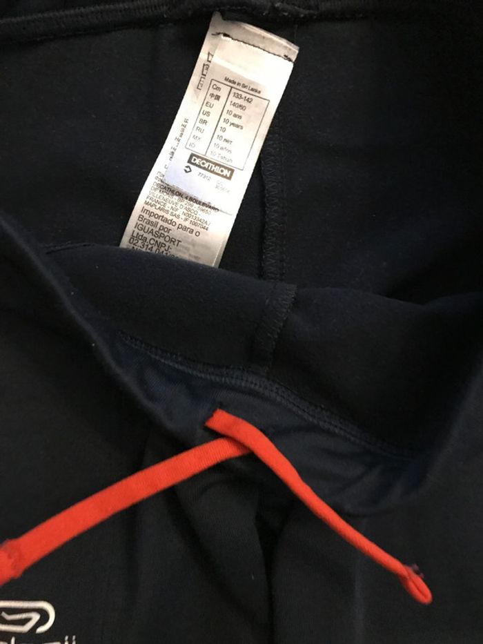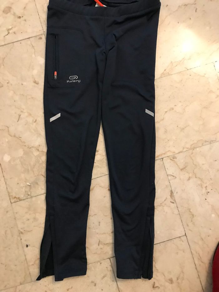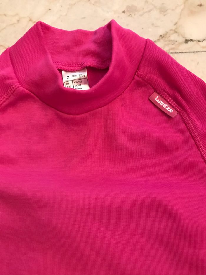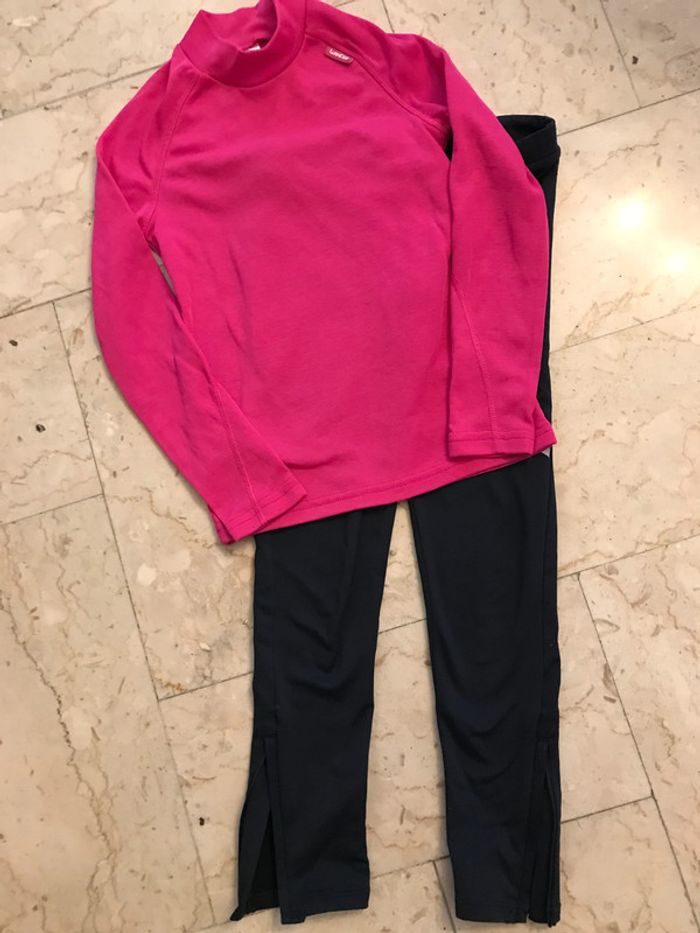 Polo fuchsia à manches longues avec découpes Encolure ronde avec col cheminée Polyester & élasthanne Pantalon marine forme legging avec fermeture éclair au bas Taille ajustable avec lien rouge Poche zippée sur le côté droit Très bon état Taille : 10 Ans Marque : DECATHLON