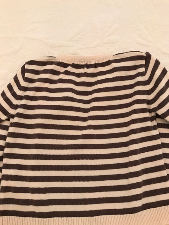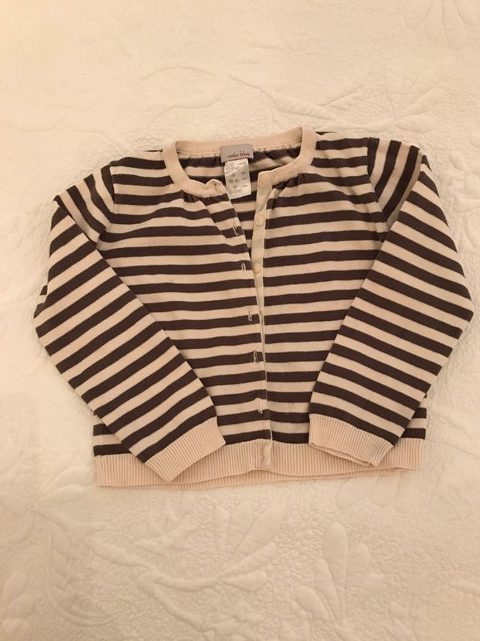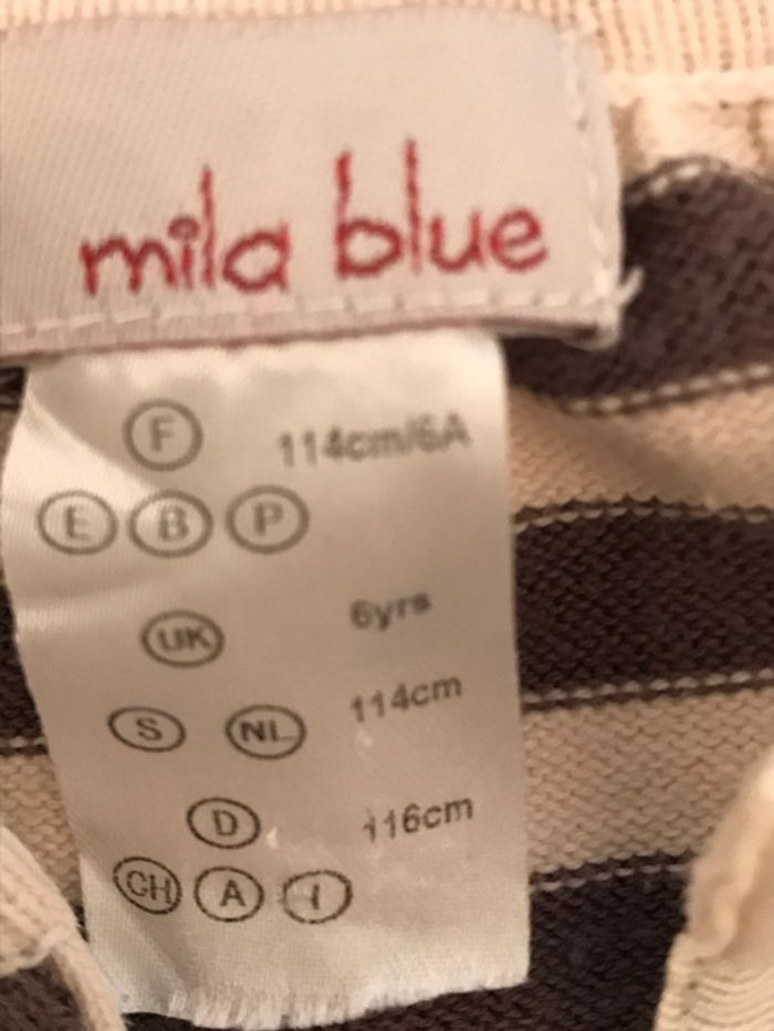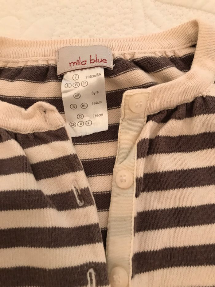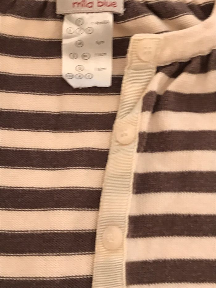 Gilet à rayures beige et taupe Bas du gilet, poignet et tour du cou en côtes fines Petites fronces autour de l’encolure Composition : 100 % coton Bon état Age : 6 Ans Marque : MILA BLUE #6Ansdavicl