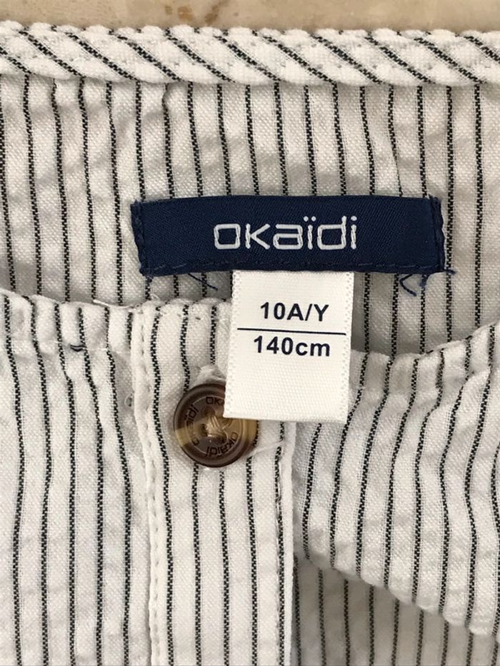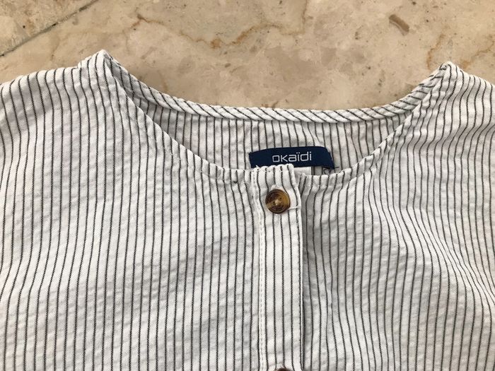 Robe ouverte sur le devant et fermée par boutons Taille basse avec lien marine pour bien l’ajuster Ras le cou, petites manches avec revers et petite patte avec bouton Coton légèrement gaufré Très bon état Taille : 10 Ans Marque : OKAIDI