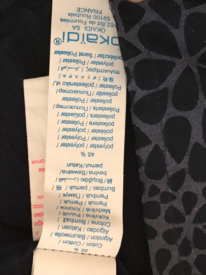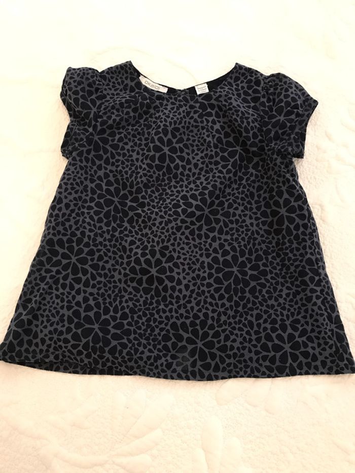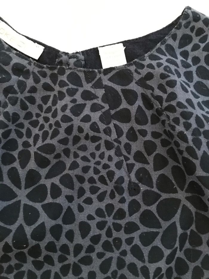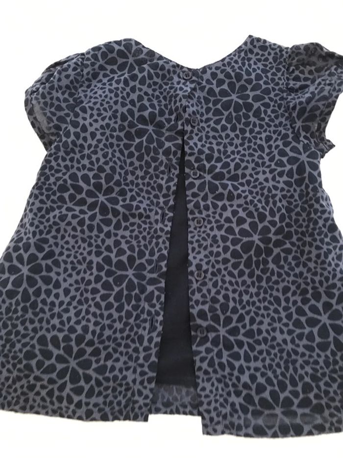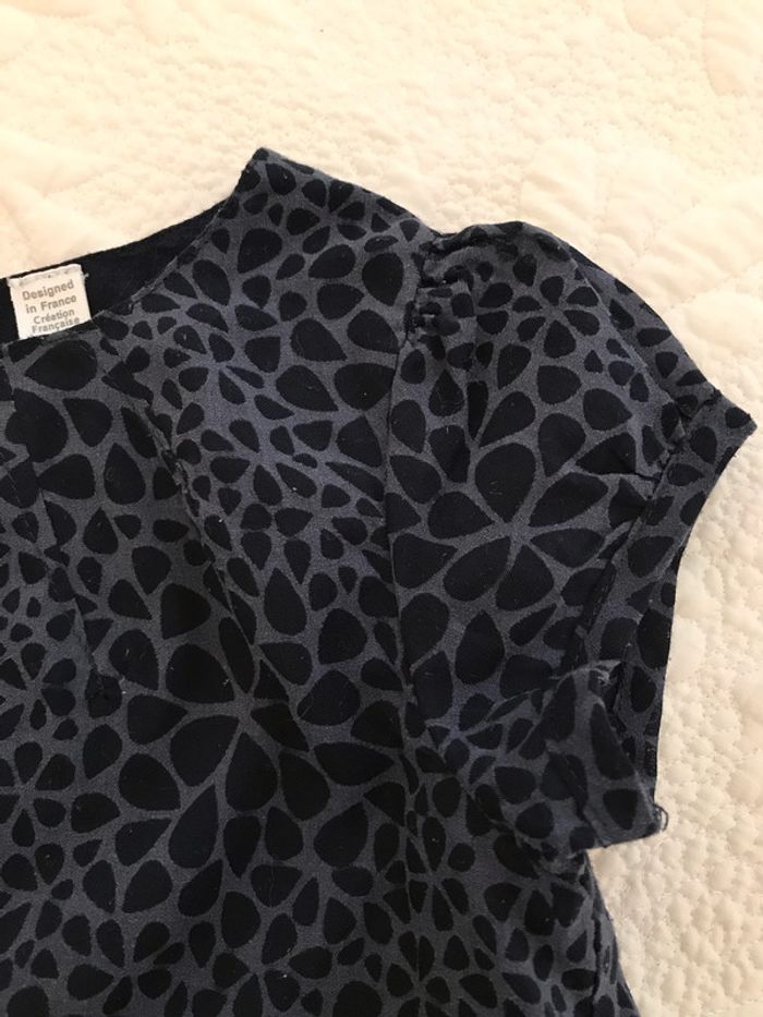 Blouse très gracieuse avec ses petites manches ballon Ouverte entièrement au dos Encolure ronde avec pinces en biais qui dînent de l’ampleur Dessus en tissu voile avec impression qui joue la transparence Dessous marine en voile de coton Matière : 55% coton et 45% polyester Blouse portée mais encore en bon état Âge : 4 Ans Marque : OKAIDI
