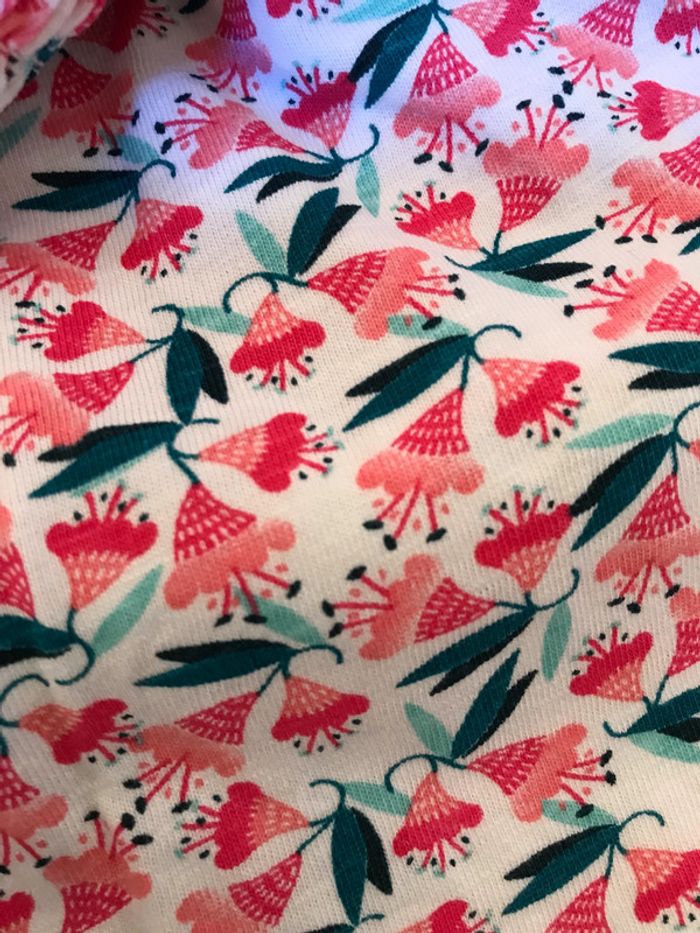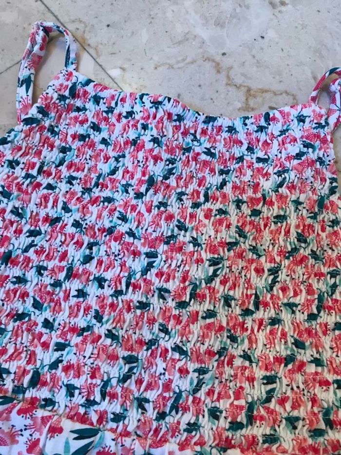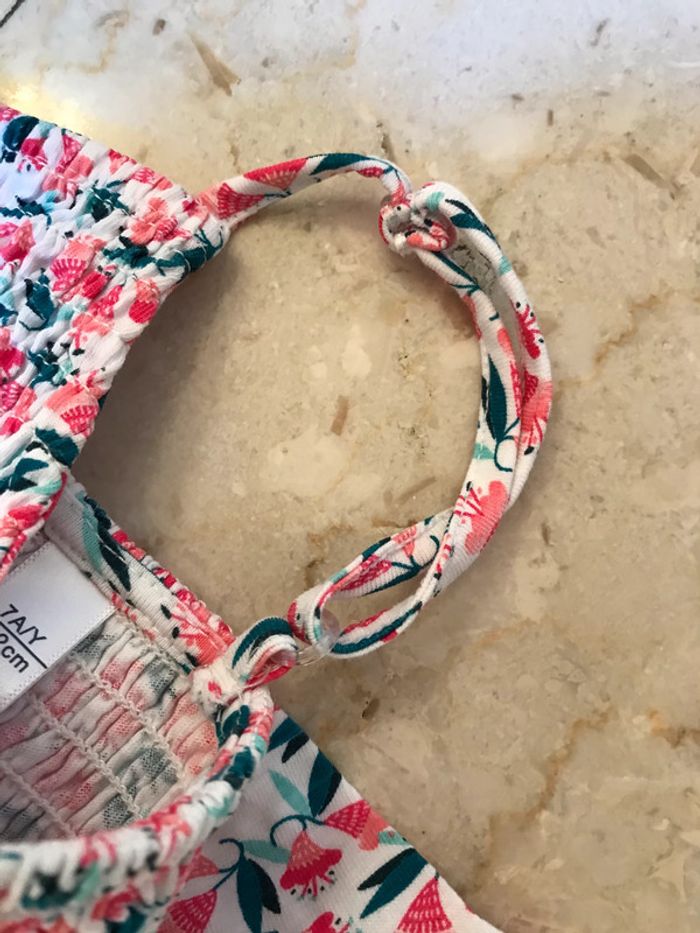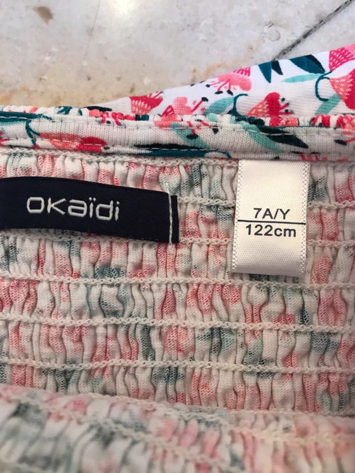 Haut à smocks élastiquées, devant et dos Bretelles réglables Composition : 100 % coton jersey fleuri Très bon état Marque : OKAIDI