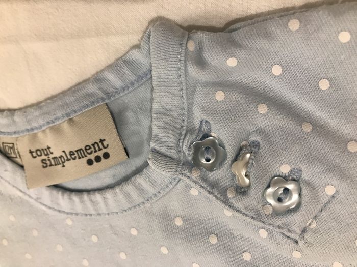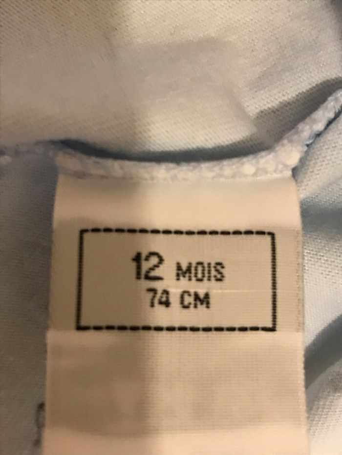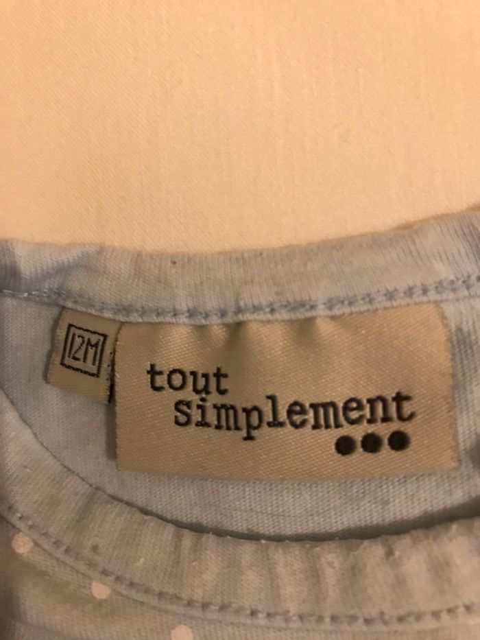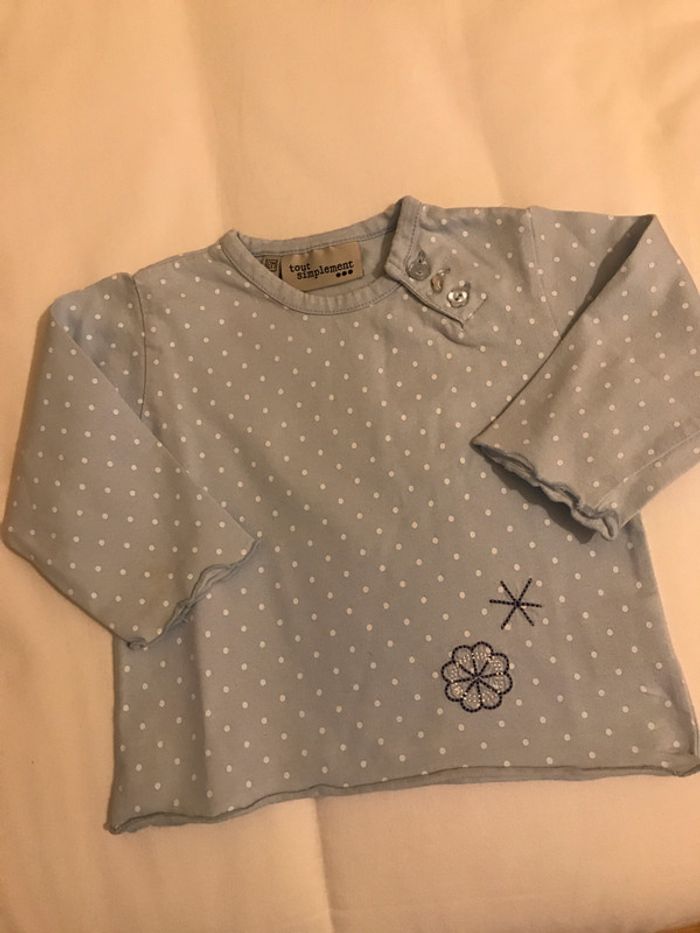 Tee-Shirt à manche longues en jersey 100 % coton Ouverture sur l’épaule gauche pour faciliter l’habillage Bon état, ni tâches ni accroc Taille : 12 Mois Marque : TOUT SIMPLEMENT