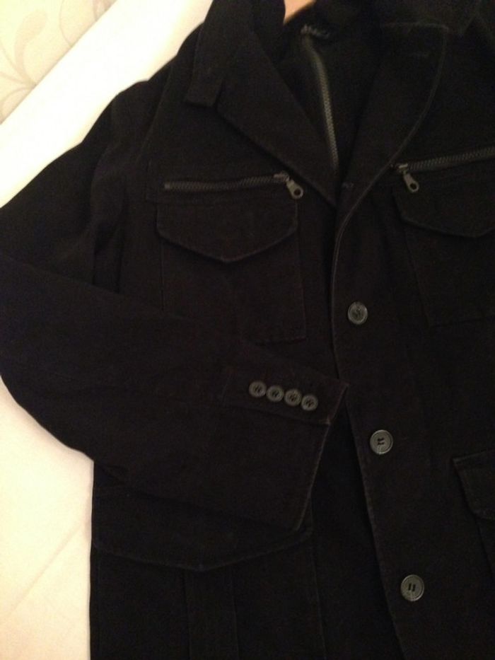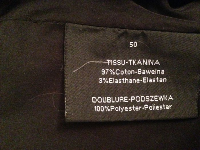 Caban fermeture par boutonnage ou zippée Fente d'aisance au milieu dos Aspect velours ras De nombreuses poches sont présentes à l'intérieur ainsi qu'à l'extérieur, zippées ou plaquées Composition : 3% Elasthanne, 97% Coton et Doublure : 100 % Polyester Taille : 50 Satisfaisant, a été porté 2 saisons (présente cependant des zones telles que les revers de poches, le col et les boutons un peu patinées)