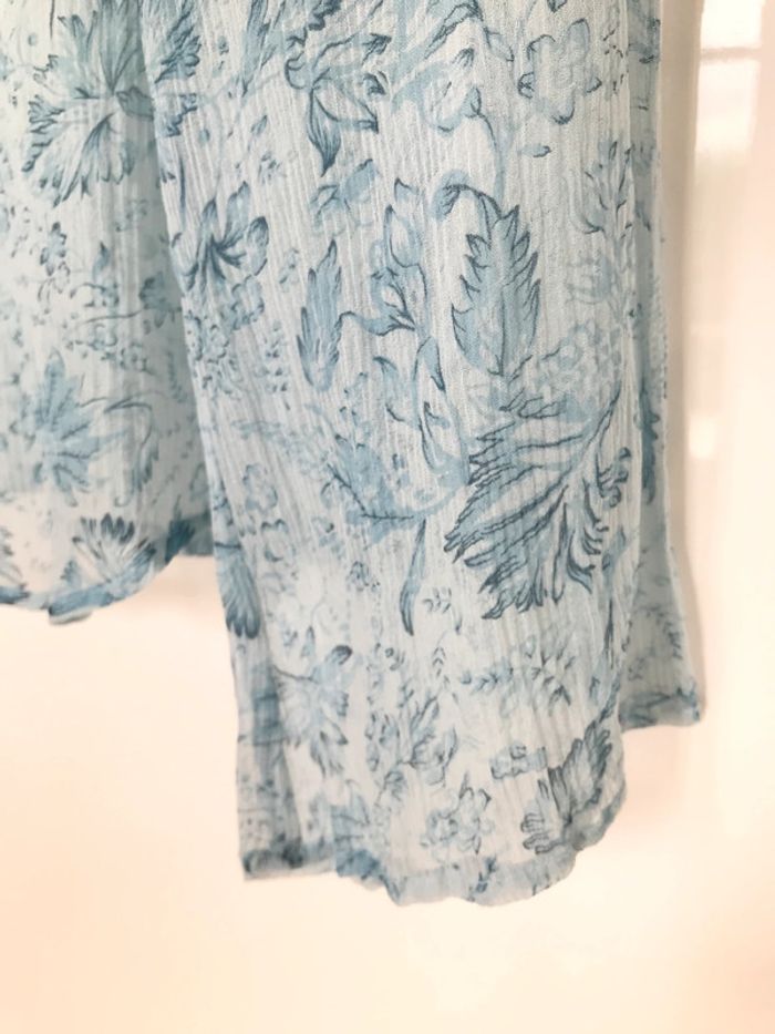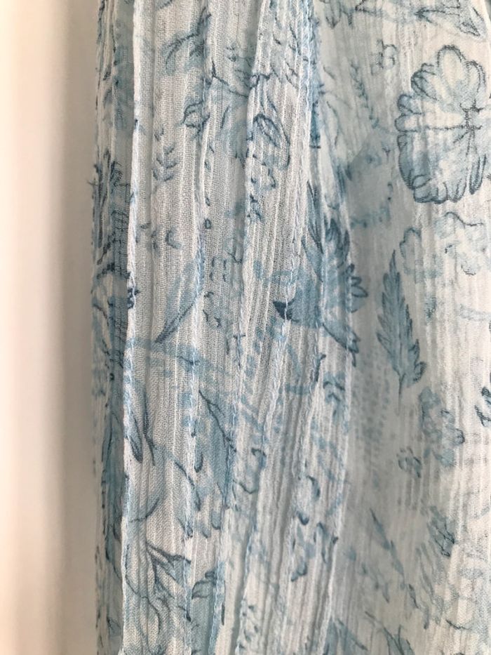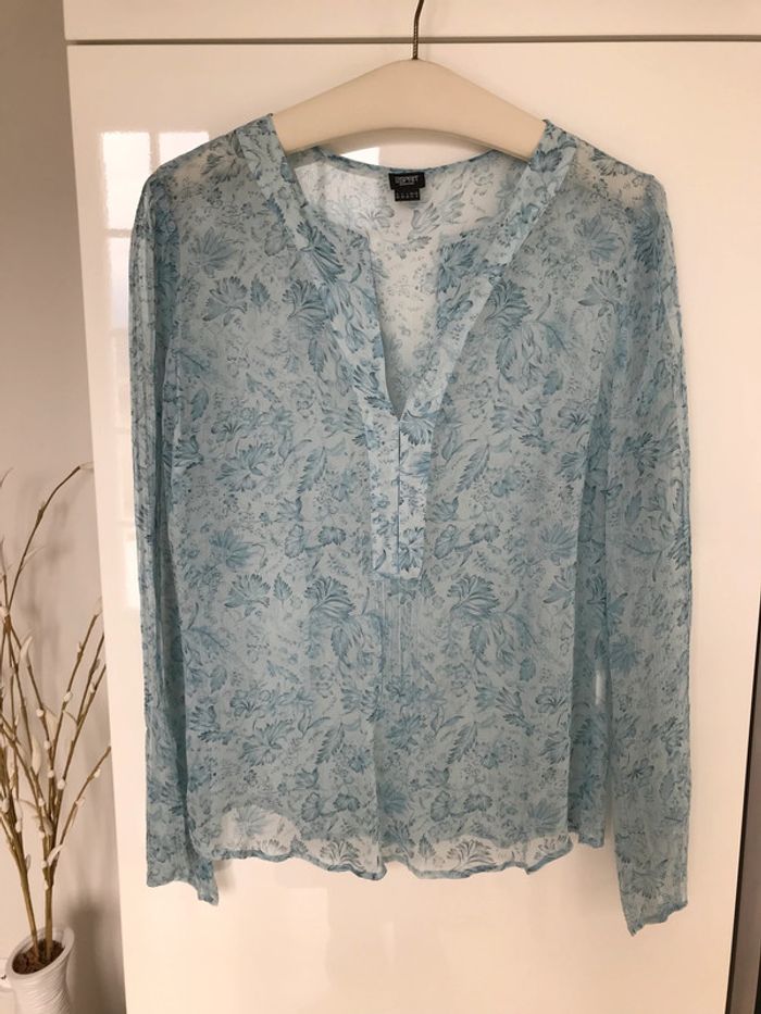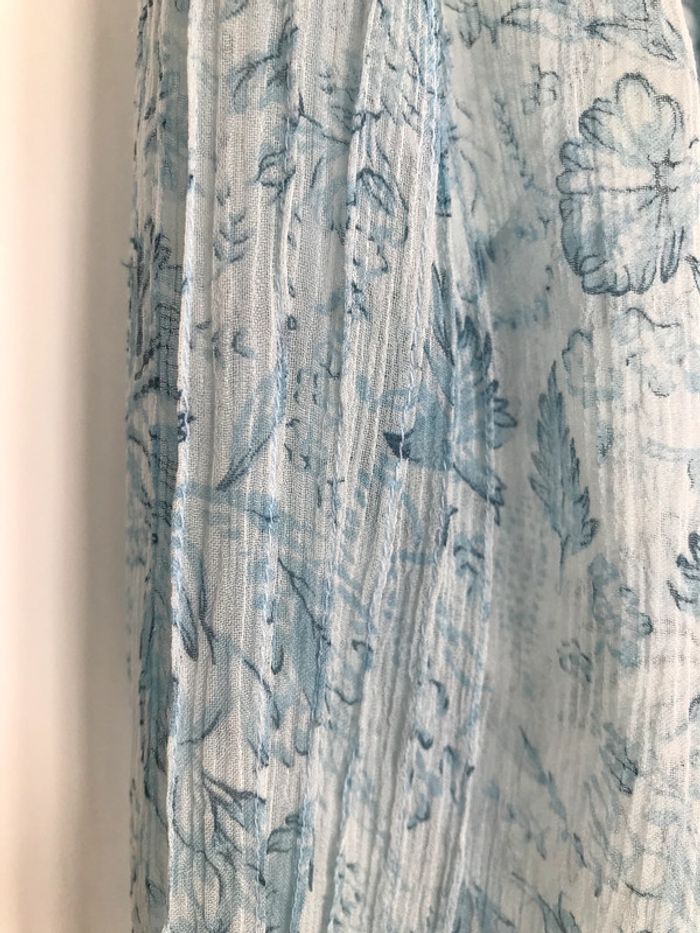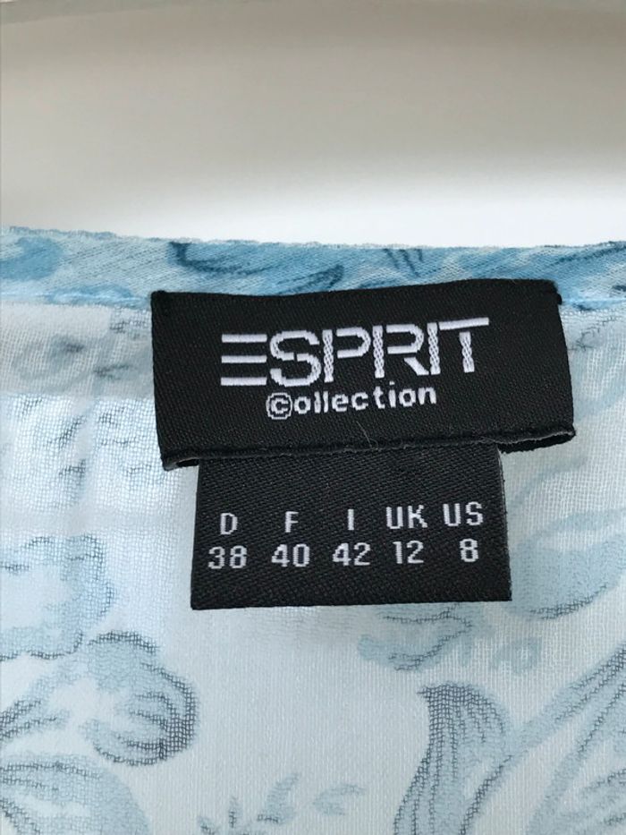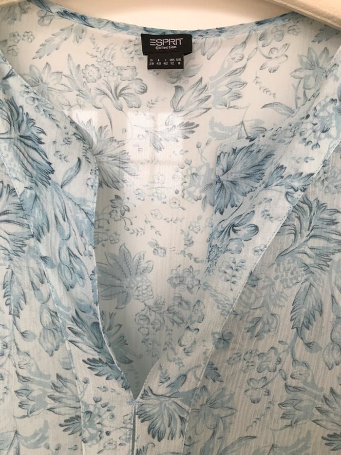 Tunique à porter par dessus un caraco Encolure échancrée devant pour faciliter l'enfilage Nervures sur le milieu devant et sur les manches (voir photos) Manche un peu évasée au bas Impression : fleuri bleu Bon état Taille : 40 Marque : ESPRIT