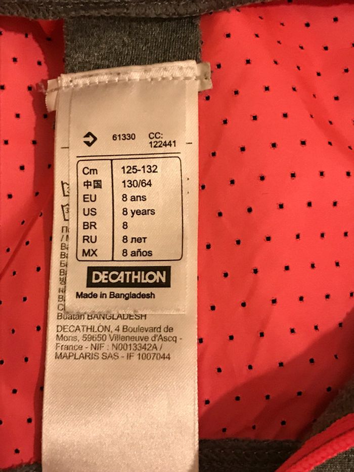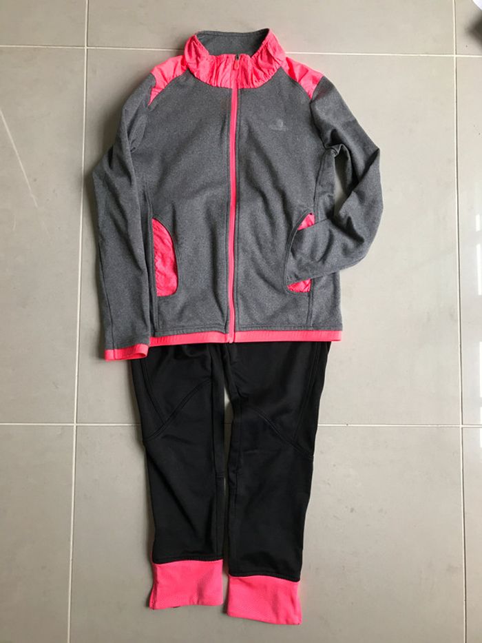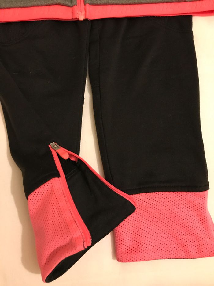 Ce survêtement est composé d'un pantalon et d'une veste zippée Pantalon forme corsaire Couleur : Veste grise chinée avec col et poignets rose corail Pantalon noir avec bas de pantalon rose corail (fermeture zippée au bas du pantalon) Composition : 189 % polyester et 11 % Elashtane Empiècement et découpes rose corail : 100 % polyester Taille : 8 Ans Bon état Marque : DOMYOS #8ansdavicl