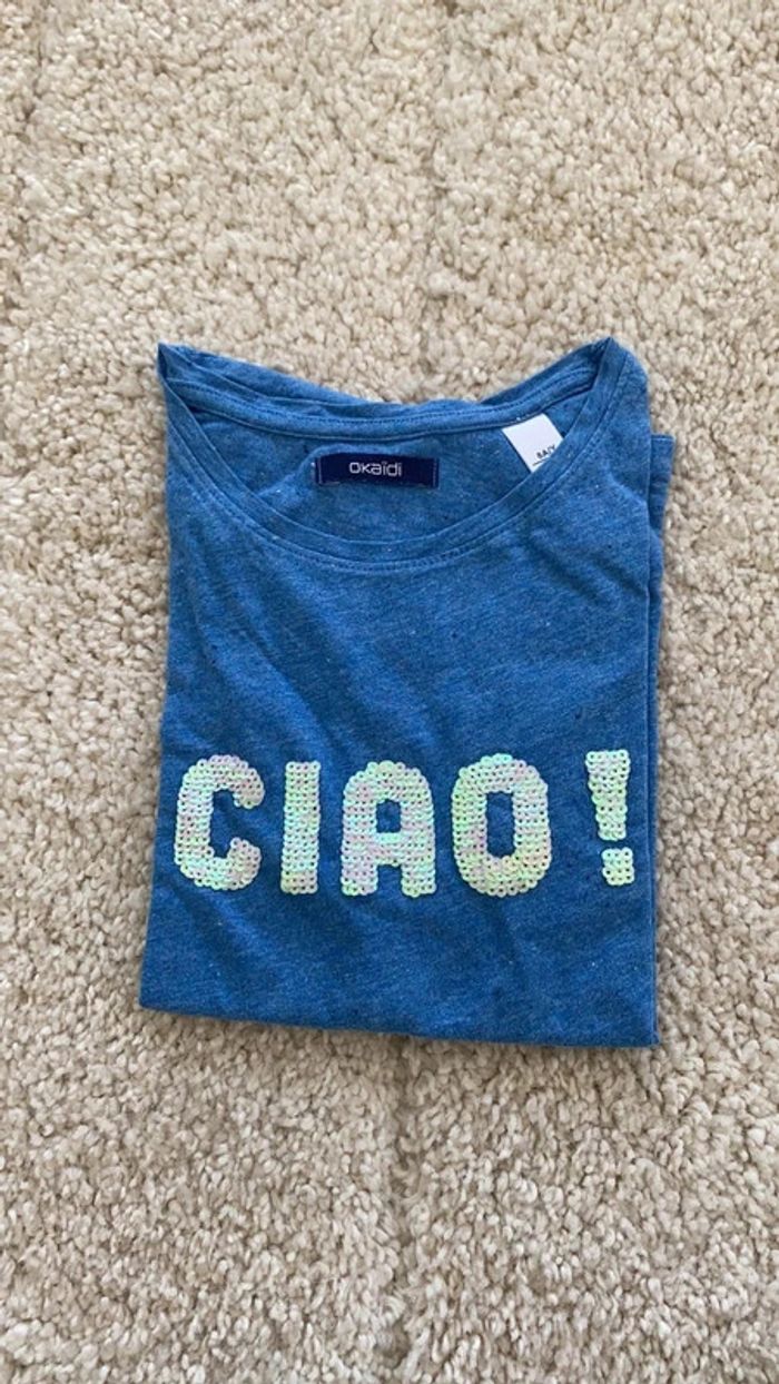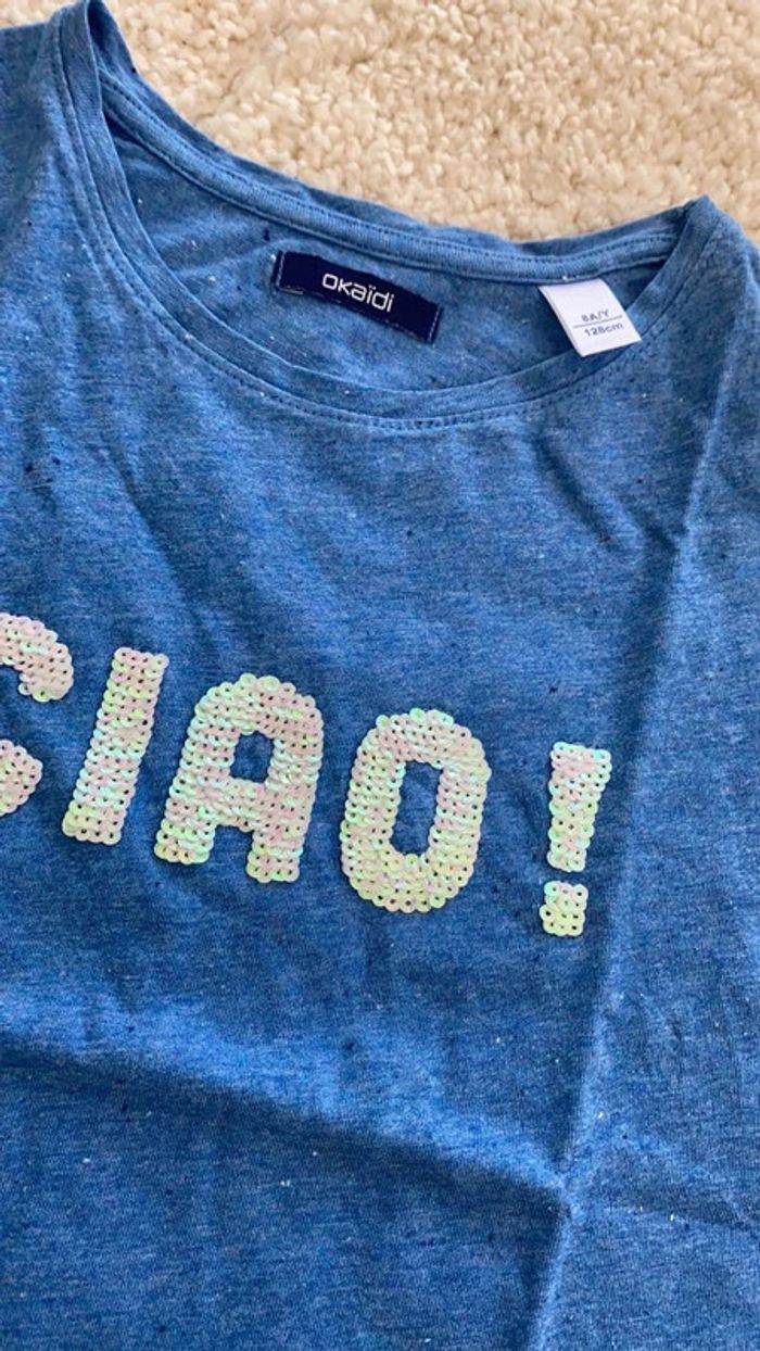 T shirt bleu Impression sequins blancs Manches courtes Okaidi 8 ans Très peu porté