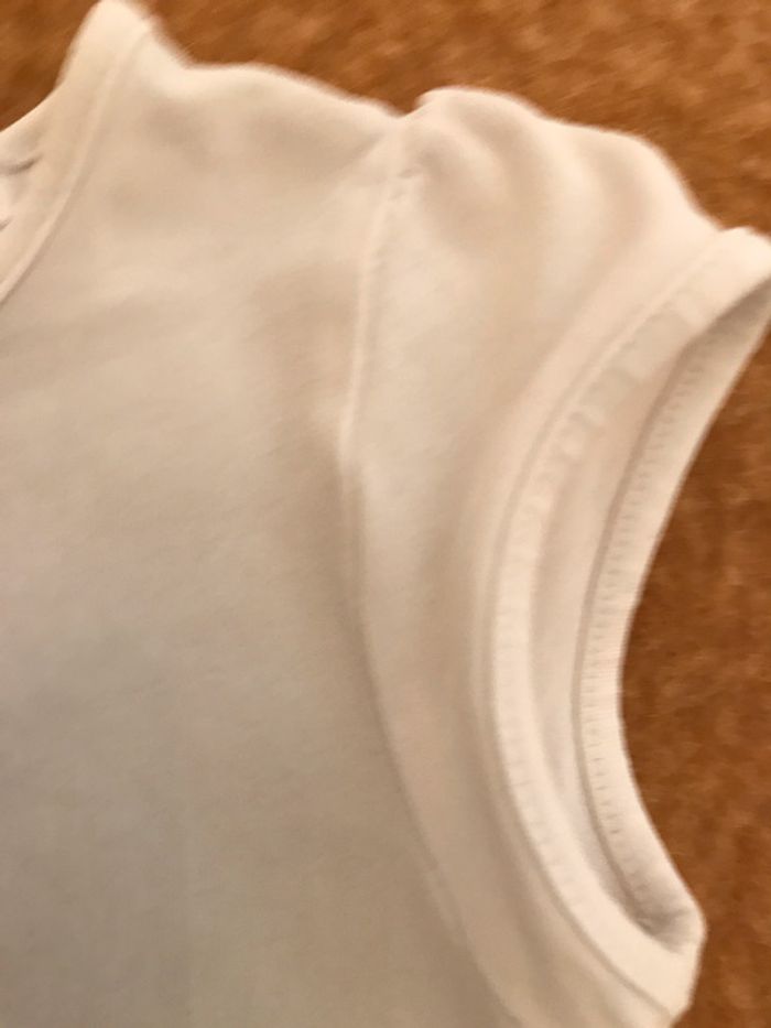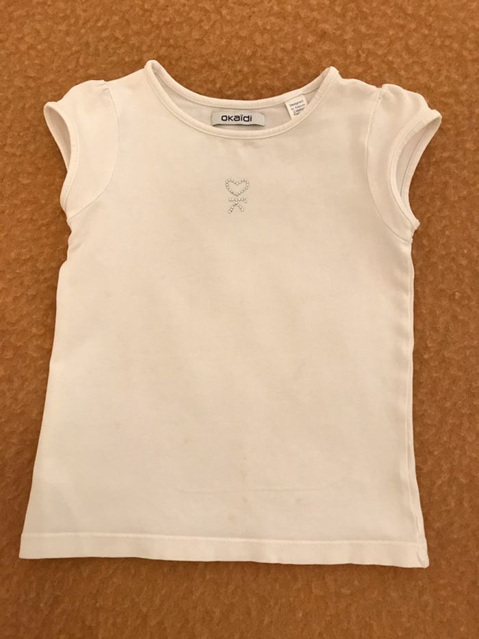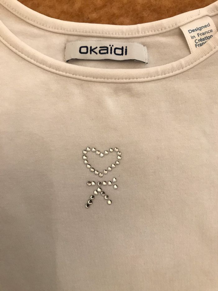 Encolure ronde bordée d’un biais Petites manches froncées Incrustation brillante : Petit Cœur Composition : 100 % coton Bon état Taille : 4 Ans Marque : OKAIDI #4ansdavicl