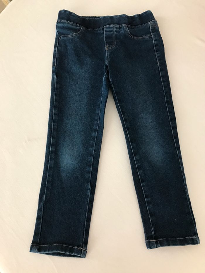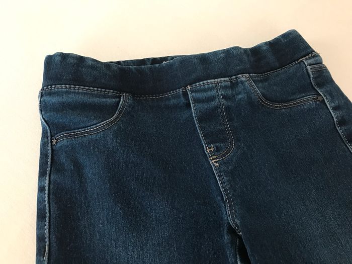Tregging coupe slim. Denin extensible. Taille plate élastiquée. 2 Fausses Poches arrondies sue le devant 2 Poches plaquées au dos Composition : 71 % coton, 2% Elasthanne, 24 % Polyester, 3 % Viscose Bon état Couleur : Marine jean’s
