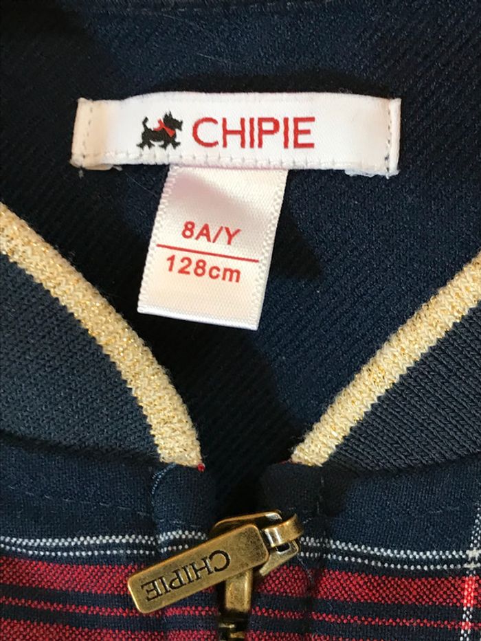 Entre sweat et blouson Col rond avec bord côtes 2 Poches devant Bords cotés en finition (avec bordure dorée) Très bon état (pratiquement neuf) Âge : 8 Ans Marque : CHIPIE