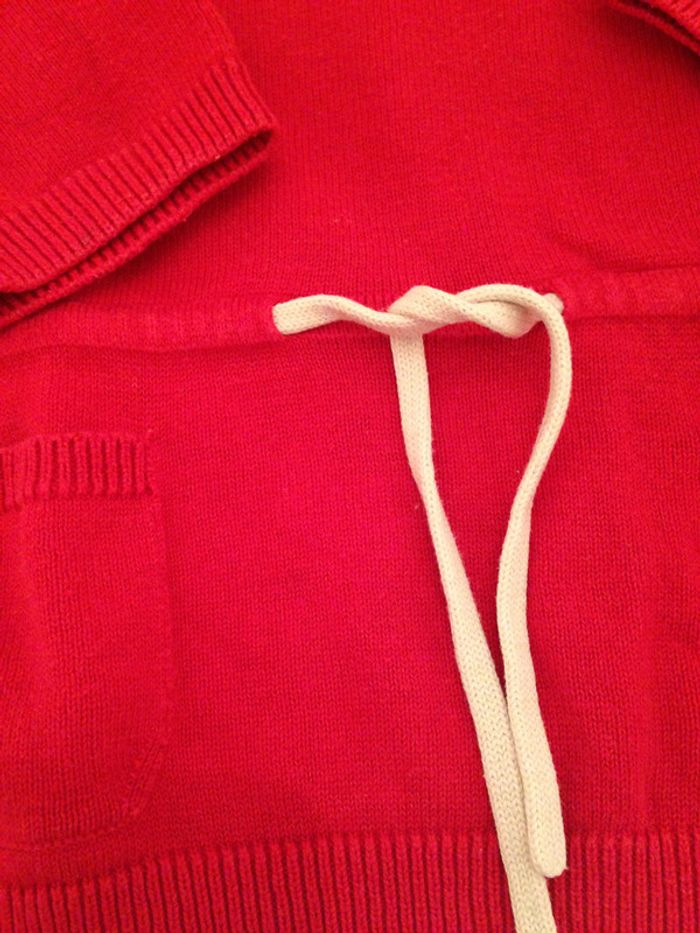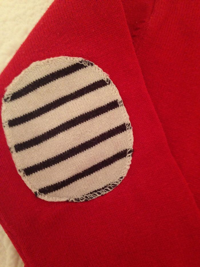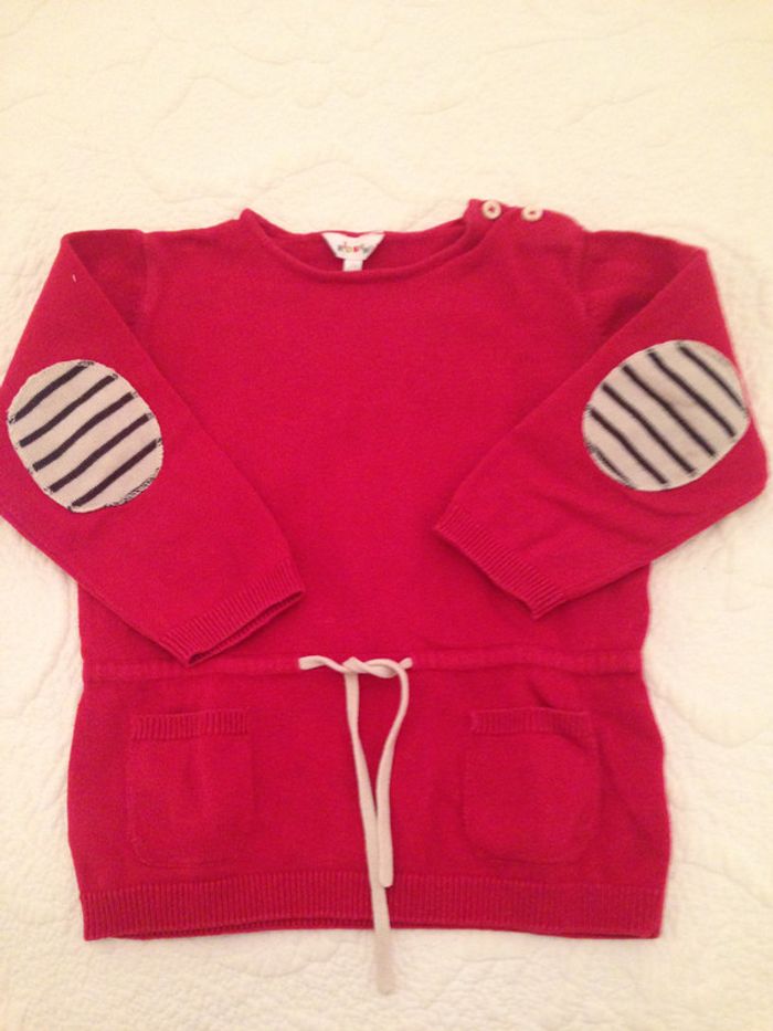 Pull maille fine de couleur rouge Encolure arrondie avec bouton sur l'épaule gauche pour faciliter le passage de la tête Manches longues avec petite pièce aux coudes en jersey blanc à rayures noires Bords-côtes en finition au bas des manches et bas du pull Petit lien à la taille pour donner de l'aisance Composition : 100% coton Bon état, ni tâche, ni accroc #3ansdavicl