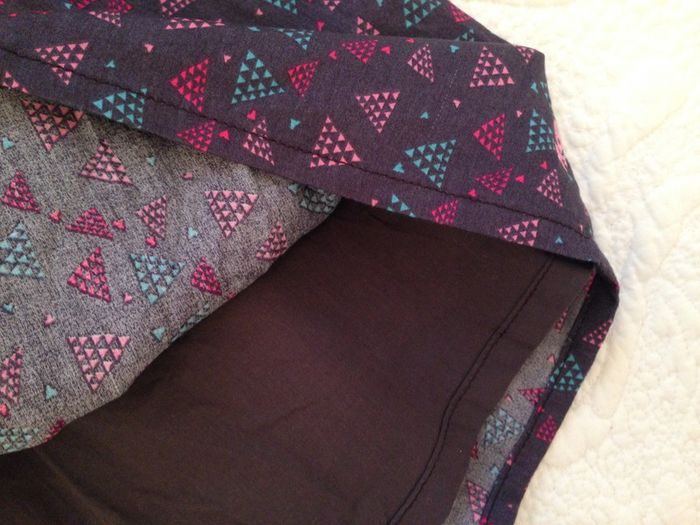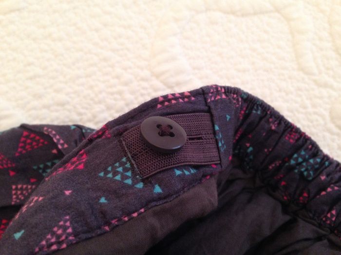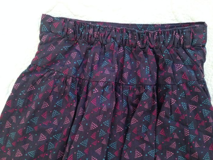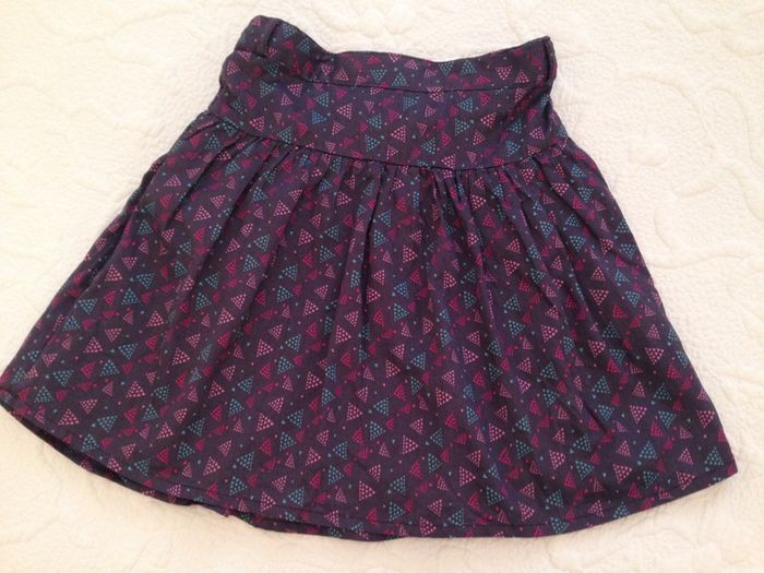 Jupe froncé sous une basque de 7cm, entièrement doublée Ceinture avec passants Pas de fermeture sur le côté mais taille élastiquée au dos avec possibilité de réglage (voir photo) Couleur : Marine un peu violet avec impressions de triangles pointillés rose, fushia et turquoise Très bon état #Enfantsdavicl
