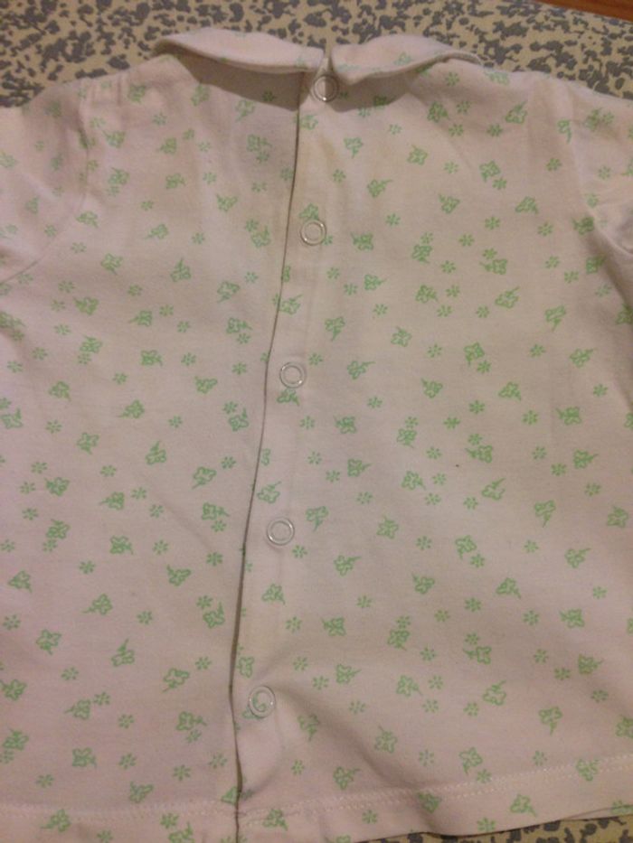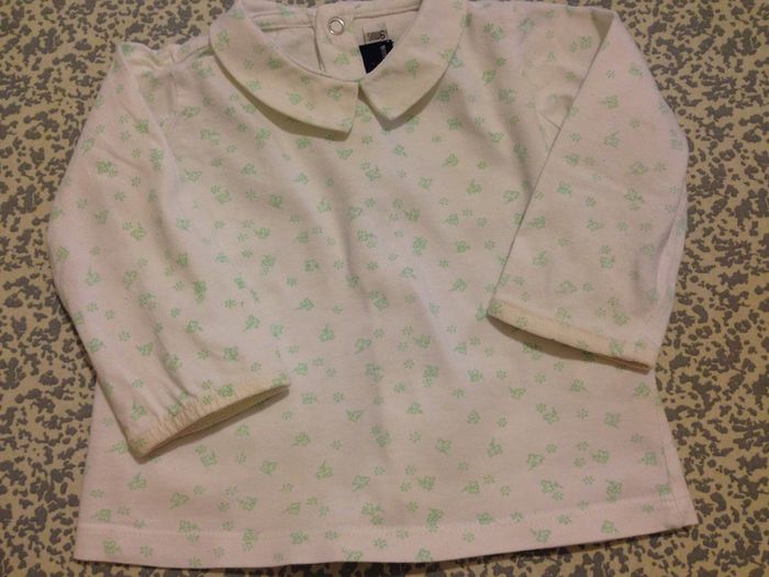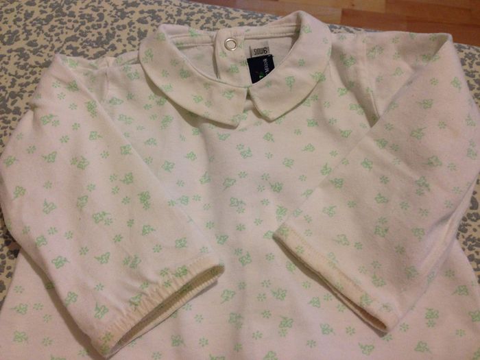 Petit tee-shirt manches longues, petit col Claudine rond Bas des manches à l'origine élastiquée, mais l'élastique est détendu Impression fleurettes vert clair Ouverture complète au dos, pour faciliter le passage de la tête, et fermeture par petites pressions Composition : 100% coton, jersey lourd Etat satisfaisant, sans trous ni tâches #Enfantsdavicl