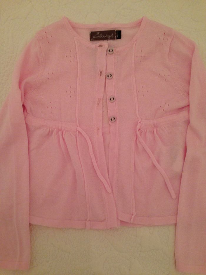Petit gilet manches longues à porter sur une robe, très féminin avec sa taille resserrée par un lien Haut du gilet avec point fantaisie et bas, uni Devant fermé par des boutons rose et œillet métallique noir Si ce n'était un petit accroc stoppé sur le haut d'une manche, très bon état (voir photo) #Enfantsdavicl