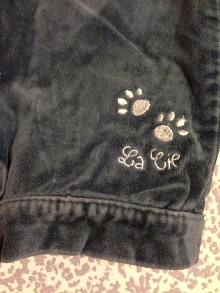 Joli petit pantalon pour petite fille de 24 Mois de couleur bleu/gris Elastiqué à la taille et devant, à l'intérieur un lien pour resserrer un peu plus Jambes légèrement resserrées par un ourlet Petites broderies aux poches et au bas de la jambe droite 2 petites poches au dos Bon état