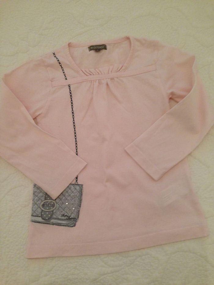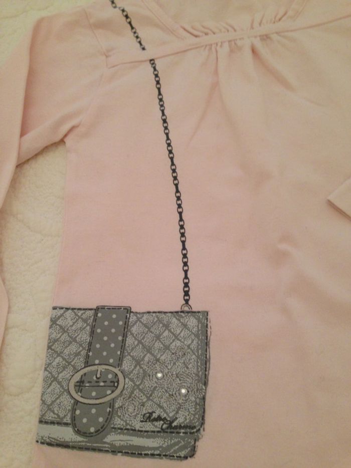 Joli tee-shirt rose pâle Encolure ronde avec découpe à petits plis (voir photo), très féminin Dessin d'une petite pochette portée sur le côté droit du tee-shirt, couleur gris Composition : 100% coton Bon état #Enfantsdavicl
