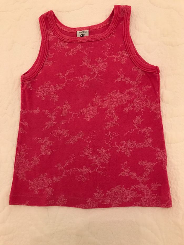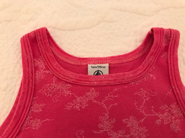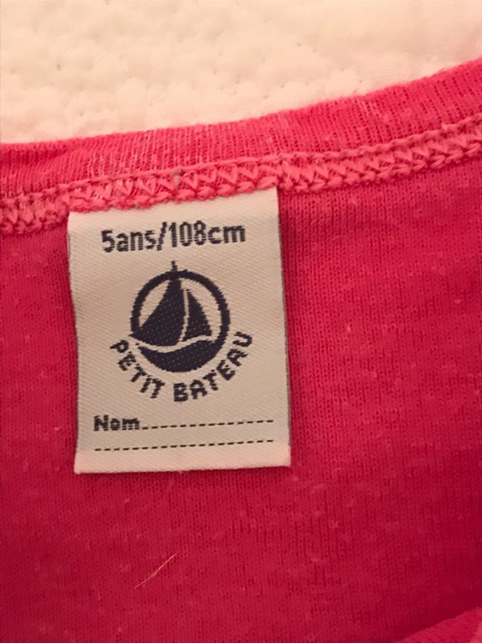Finition : Biais autour de l’encolure et des manches Couleur : fushia avec petits motifs blancs feuillage Matière: 100 % Coton Très bon état Age : 5 Ans Marque : PETIT BATEAU