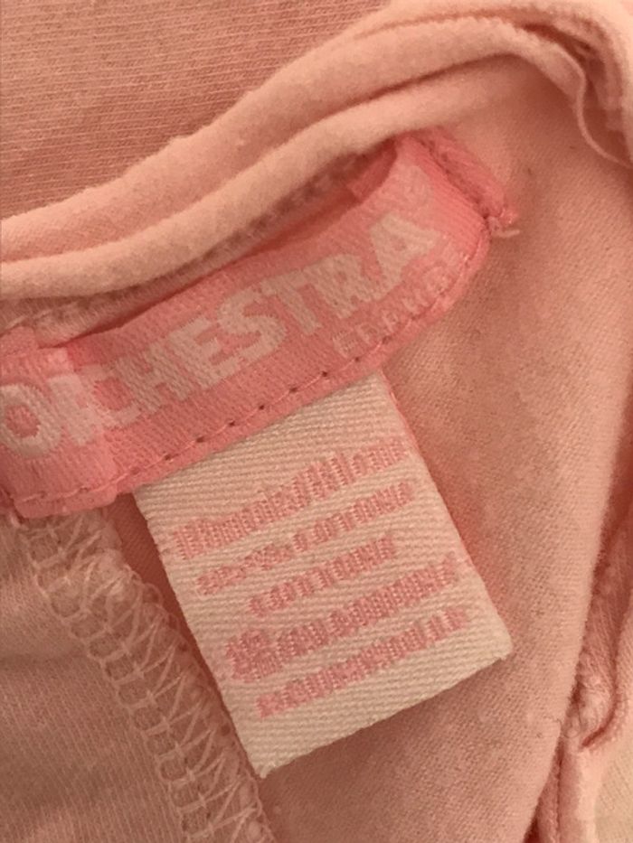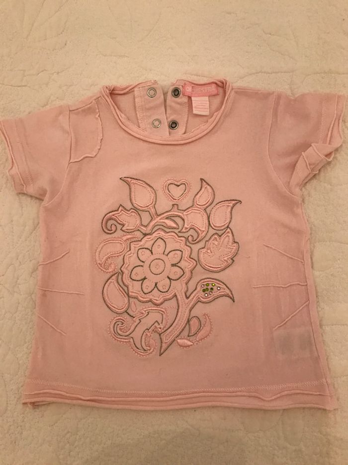 Encolure ronde bordé d’un petit roulotté Même bordure au bord des manches et au bas du tee-shirt Ouverture au dos pour faciliter l’habillage Le devant est agrémenté d’une jolie broderie et de petites nervures sur les côtés Etat satisfaisant, le support de la broderie au dos est un peu effilochée (rien ne se voit devant) Taille : 18 Mois Marque : ORCHESTRA