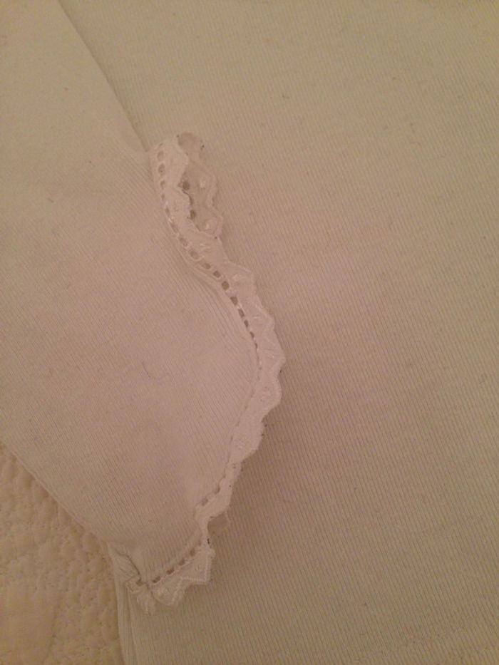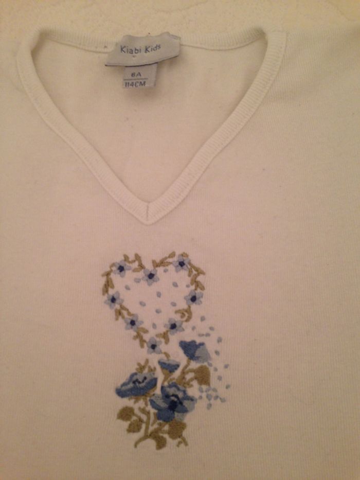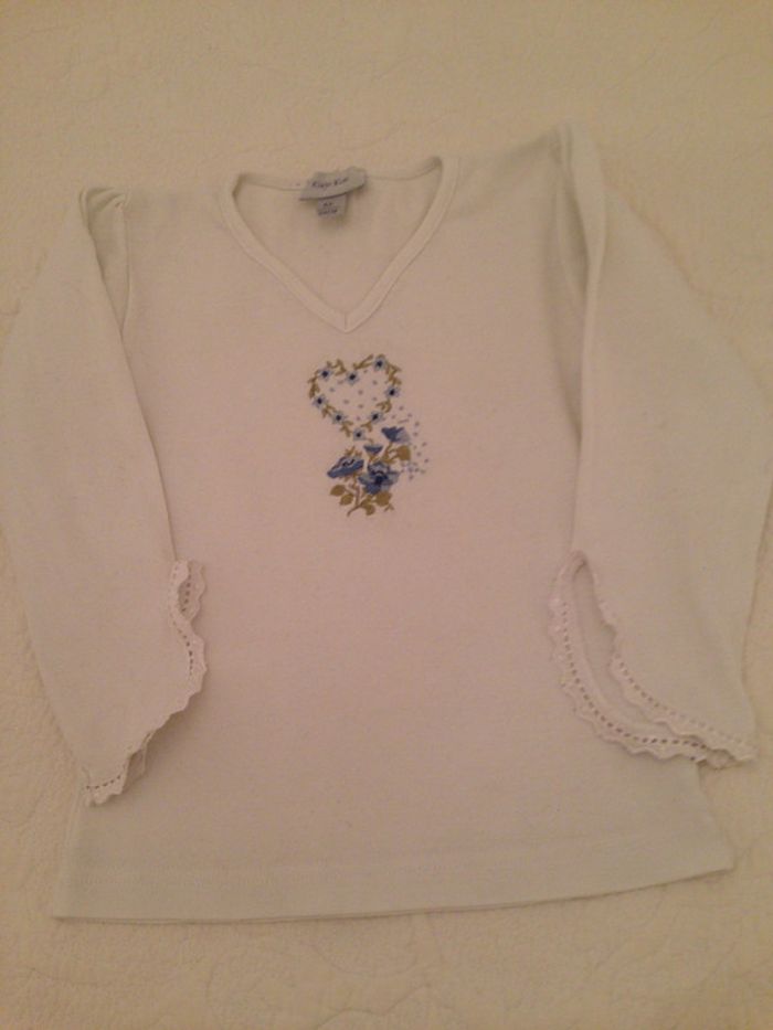 Très joli tee-shirt fantaisie, blanc avec broderie bleue et verte Encolure pointure finie par un biais Manches longues avec découpe bordée d'une dentelle #Enfantsdavicl