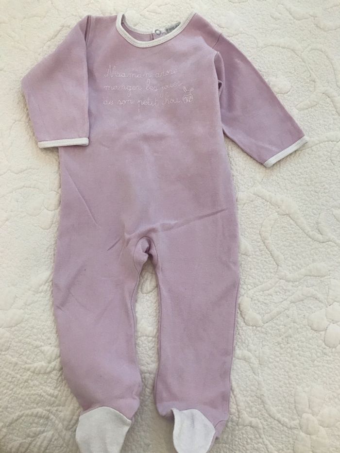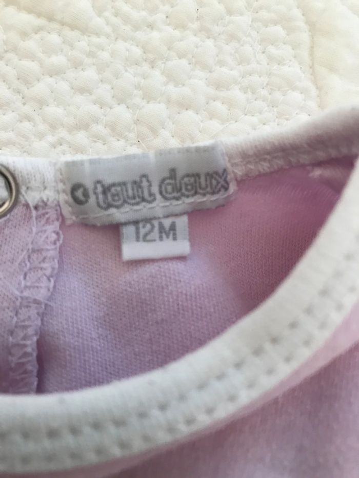 Pyjama pour l’inter-saison, en jersey, 100 % coton Ouverture pressionnée au dos Couleur : 1 mauve et l’autre rose Composition : 100 % coton Article porté mais encore satisfaisant Age : 12 Mois Marque : TOUT DOUX