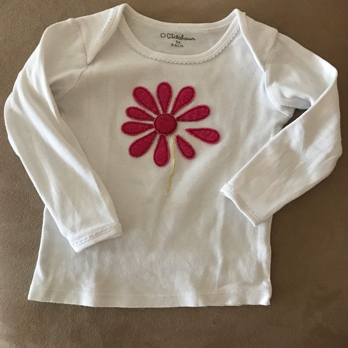 Encolure ronde avec biais terminé par un picot Manches longues avec biais au poignet terminé aussi par un picot Couleur :Blanc avec incrustation fleur rose fushia Bon état Age : 3 Ans Marque : KITCHOUN #3ansdavicl
