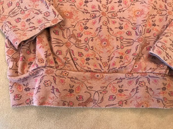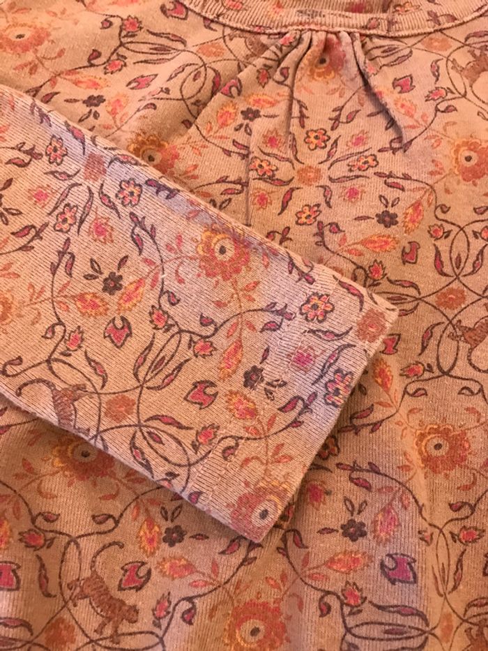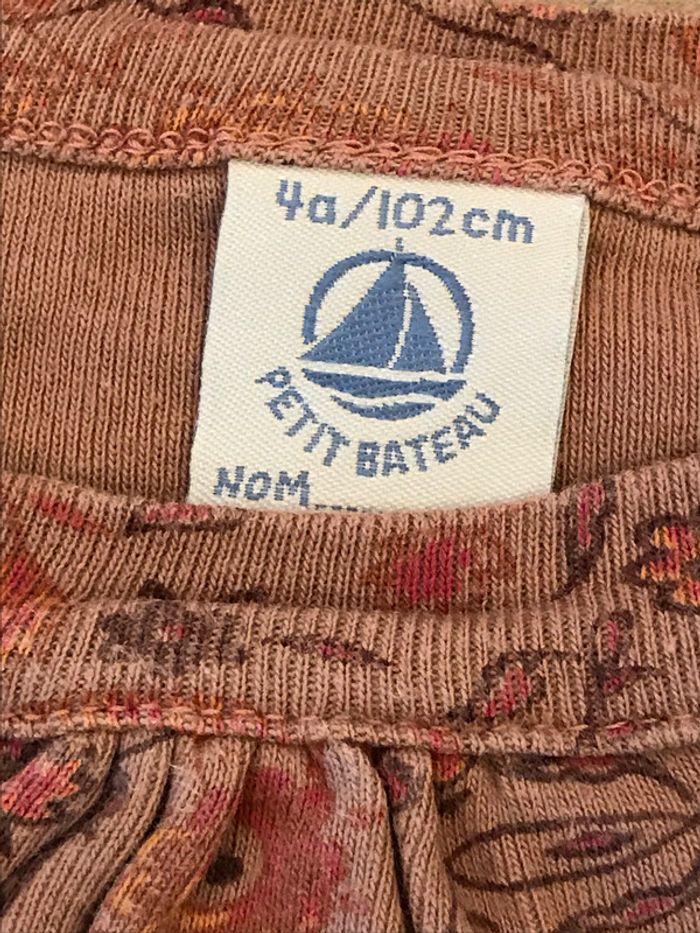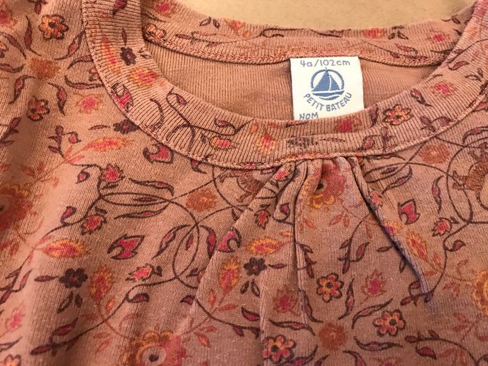 Encolure ronde avec biais large autour du cou Forme pull, avec ourlet au bas du tee-shirt qui resserre le bas avec fronces Couleur : Bois de Rose avec impressions (voir photo) Bon état Age : 4 Ans Marque : PETIT BATEAU