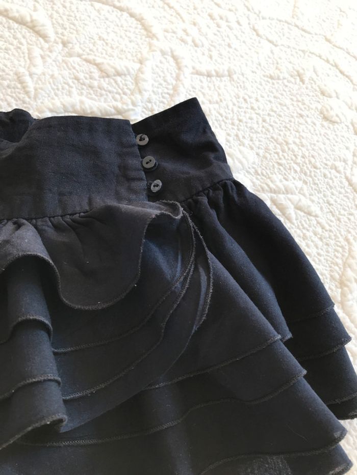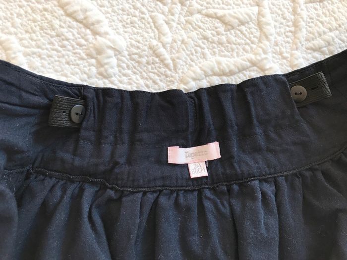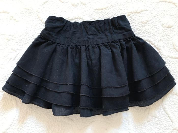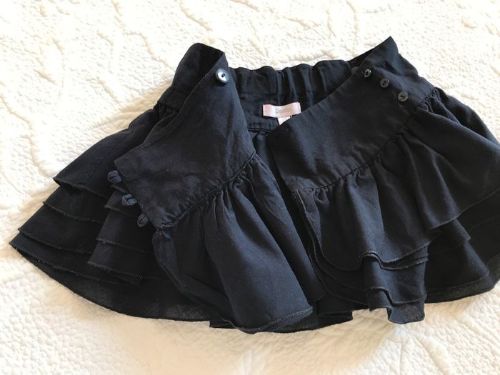 Trés jolie jupe portefeuille, ouverte sur le côté gauche Taille large élastiquée dans le dos, élastique à l’intérieur pour ajuster à la taille 3 petits boutons ferment la jupe sur le côté 3 Volants superposés donnent un très joli effet à cette jupe en voile de coton Composition : 100 % coton Bon état #Enfantsdavicl