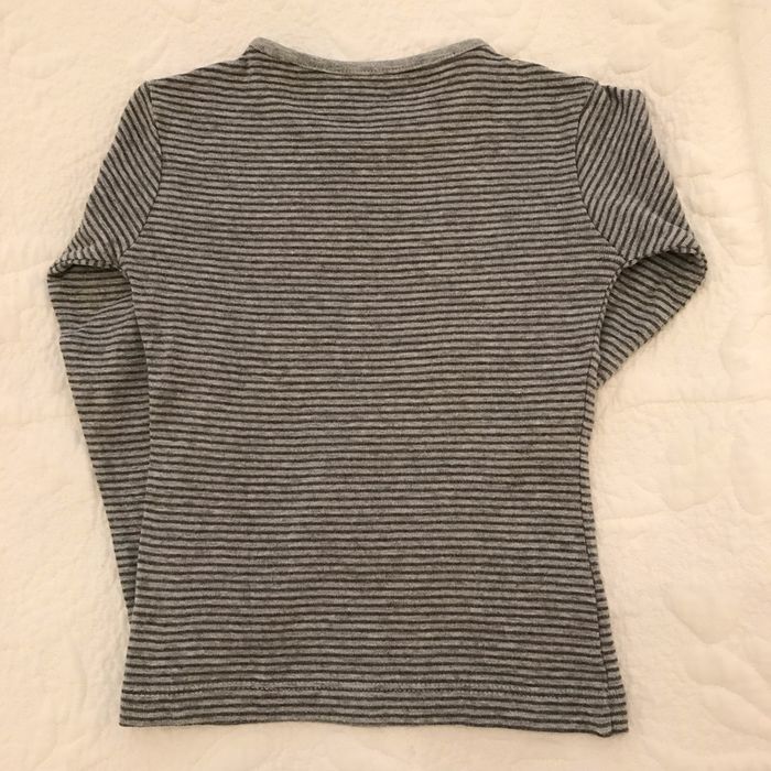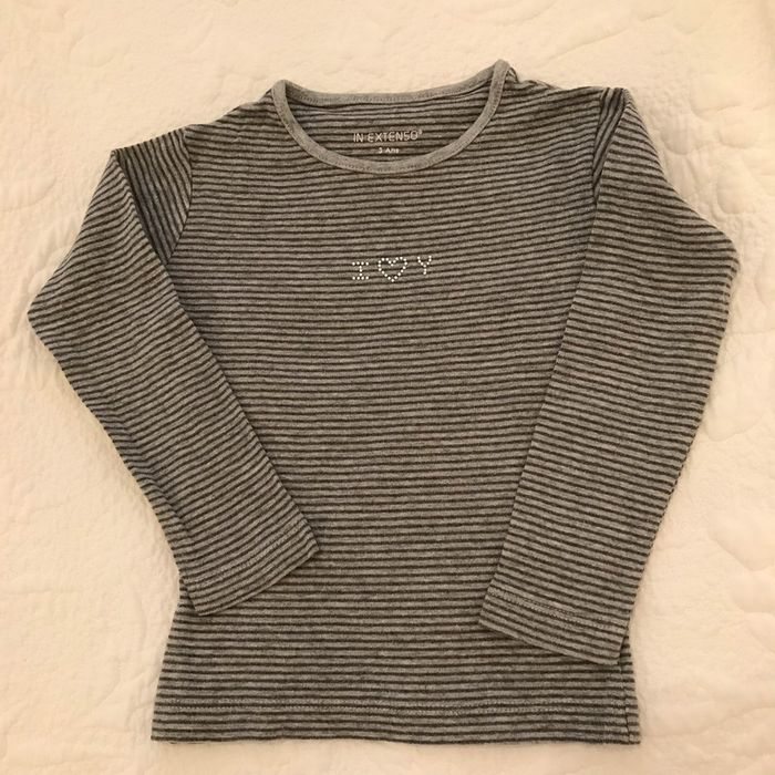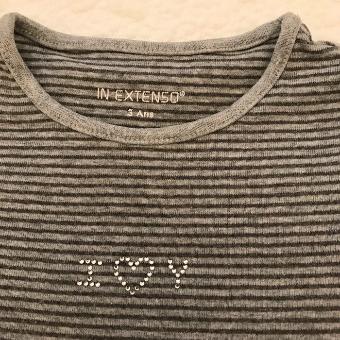Tee-shirt gris à rayures gris foncé Inscription sur le devant brillante Composition : 93 % coton et 7 % viscose Age ; 3 Ans Bon état, ni tâche ni accroc Marque : IN EXTENSO #Enfantsdavicl