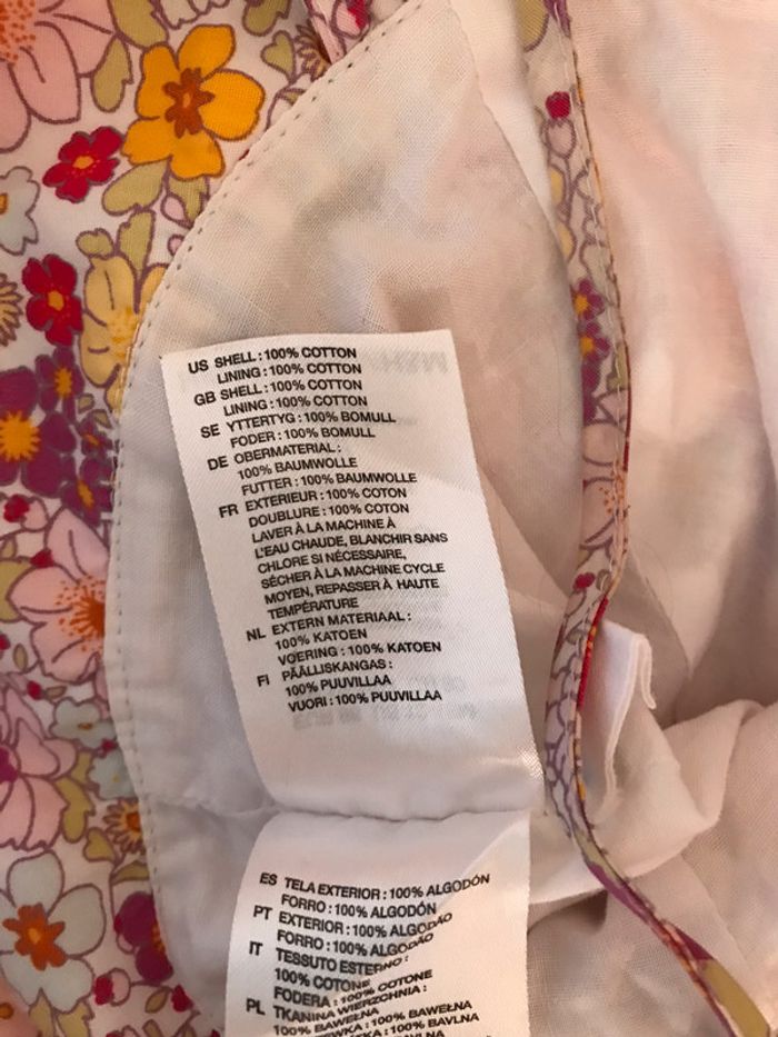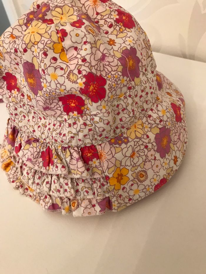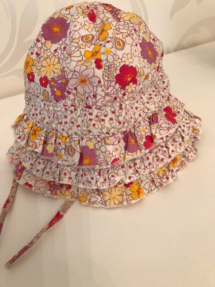 Bob très féminin en coton fleuri Rebord devant formé par 3 volants froncés et superposés Attaches sous le cou assorties au chapeau Porté mais état satisfaisant, ni accroc, ni tâche Composition : 100 % coton Taille : 12-18 Mois