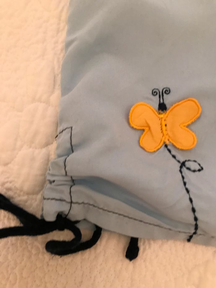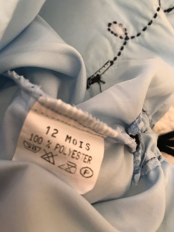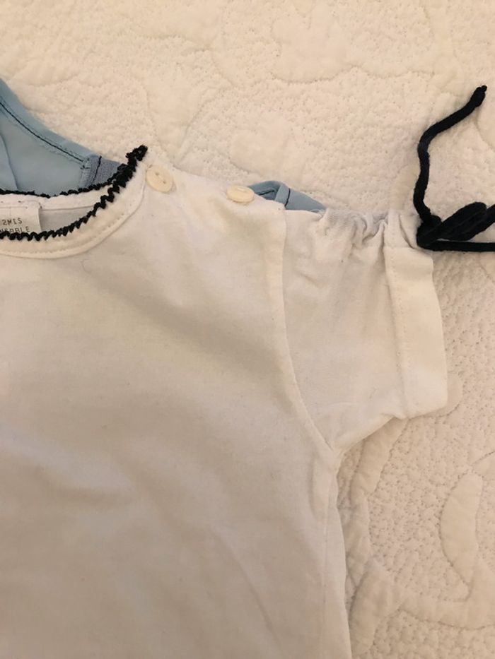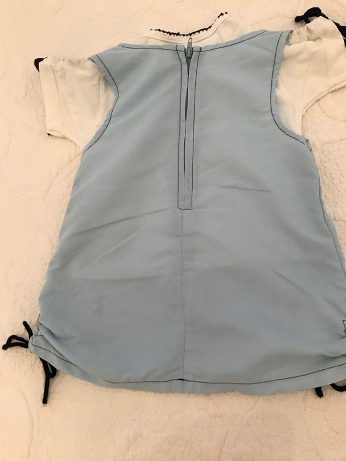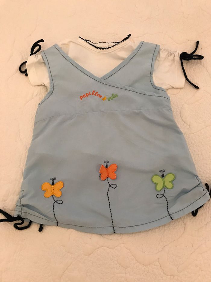 Robe forme chasuble avec petites attaches sur le bas de la robe de chaque côté Ouverture dos fermé par fermeture éclair Couleur bleu ciel avec petits papillons fantaisie Composition : 100 % polyester Tee-shirt blanc avec 2 boutons sur l’épaule gauche Petites attaches sur les manches pour fronçage Petit picot marine aurou du cou Composition : 100 % coton Bon état Taille : 12 Mois #Enfantsdavicl