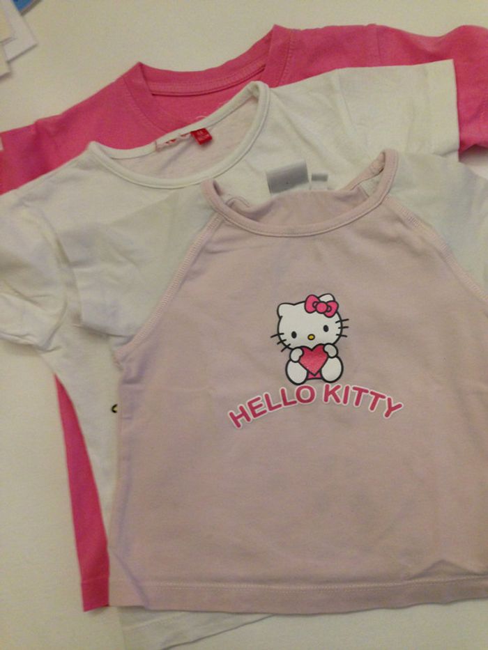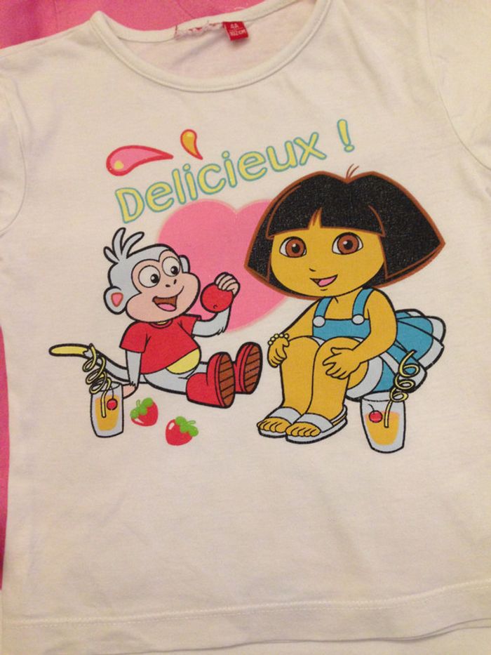 Lot de 3 tee-shirts manches courtes pour fillette de 4 ans Un tee-shirt rosé Marque HELLO KITTY en bon état (ni tâche ni défaut) Un tee-shirt blanc DORA bien porté mais sans tâche ni défaut Un tee-shirt fushia MINI de DISNET LAND très bon état (peu porté)
