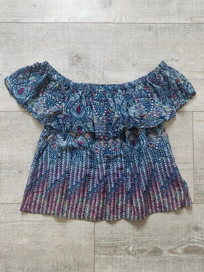 Top / blouse manches courtes et épaules dénudées, col à volants, motifs graphiques multicolores sur fond bleu marine, de la marque OYSHO. Taille : L Etat : très bon état Pour découvrir toutes les pièces femme taille L disponibles sur le shop, cliquez ci-dessous ⤵️ #greenfripfemme40 #blouse #blousemanchescourtes #topepaulesdenudees #blousefemme #motifgraphique #oysho