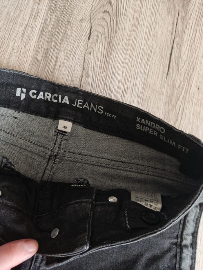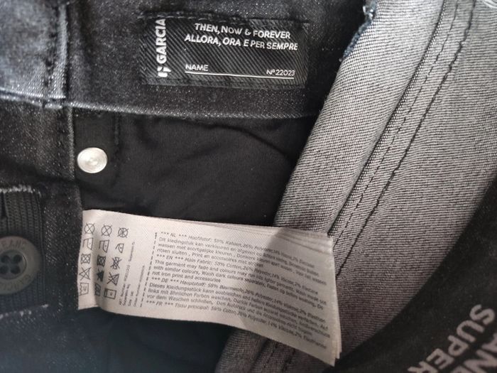 Jeans super slim, modèle xandro, poches avant et arrière, taille réglable avec élastique et boutons, couleur noir used avec bandes latérales grises , coton / polyester / viscose / elastane, de la marque GARCIA JEANS.