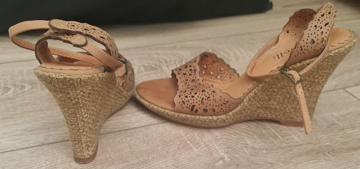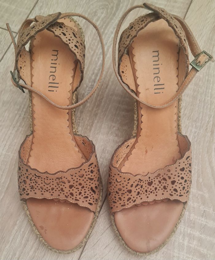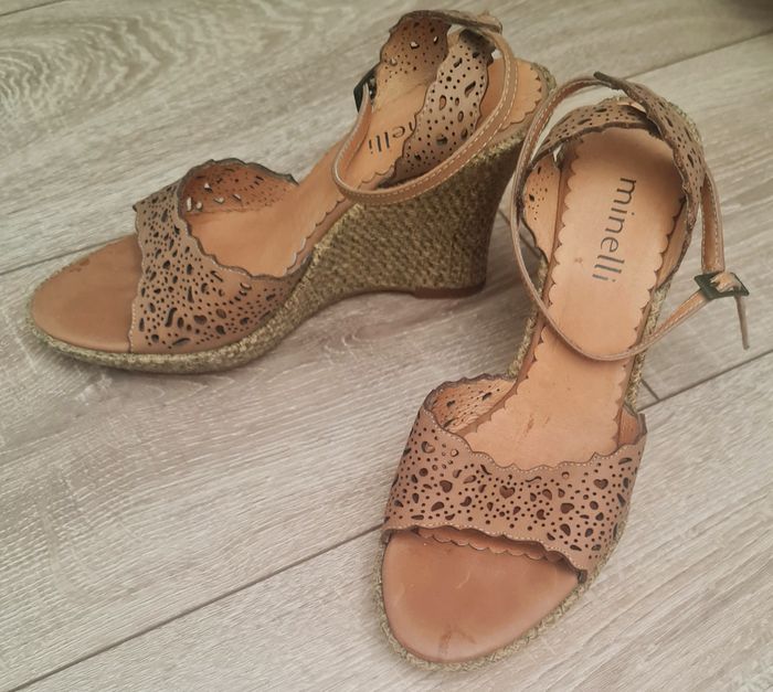 A la vente, en très bon état, cette jolie paire de sandales compensées, de couleur camel . Marque "MINELLI". En semaine, cet article peut vous être déposé à l'Espace Européen de l'entreprise, Schiltigheim.