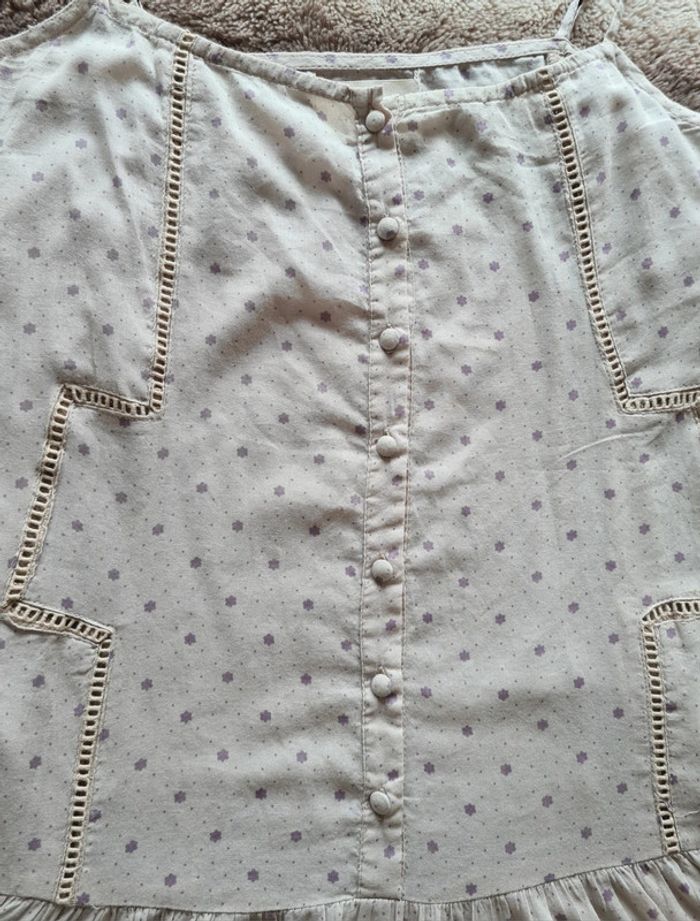 Robe courte à fines brides portée 1 ou 2 fois en très bon état comme neuve taille S 100% coton. couleur marron très clair avec motifs points et fleurs mauves #Teve_Nais_taille36_femme