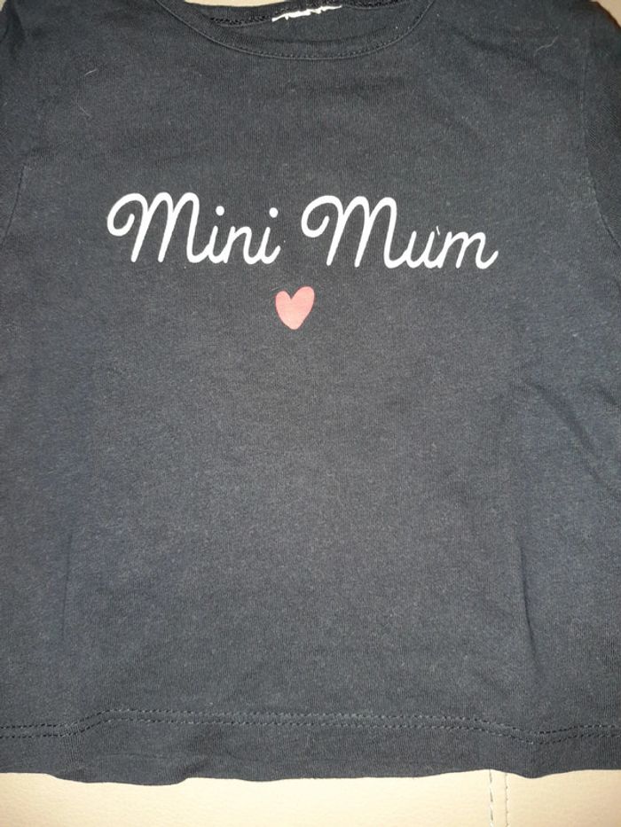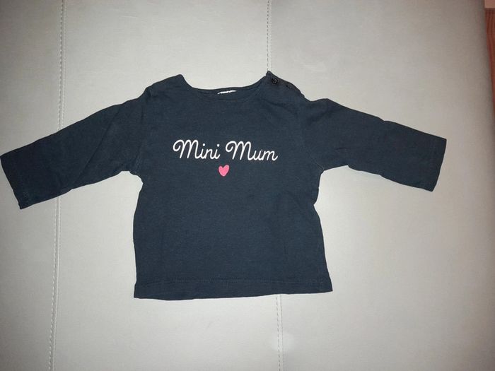 T-shirt manches longues filles en 3 mois bleu marine avec l'inscription sur le devant "mini mum" et deux petits boutons au niveau du cou #sabine26072015fille3mois