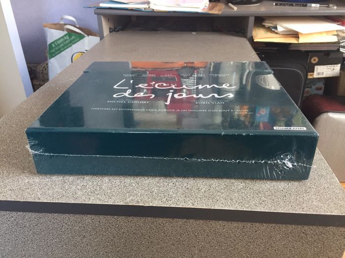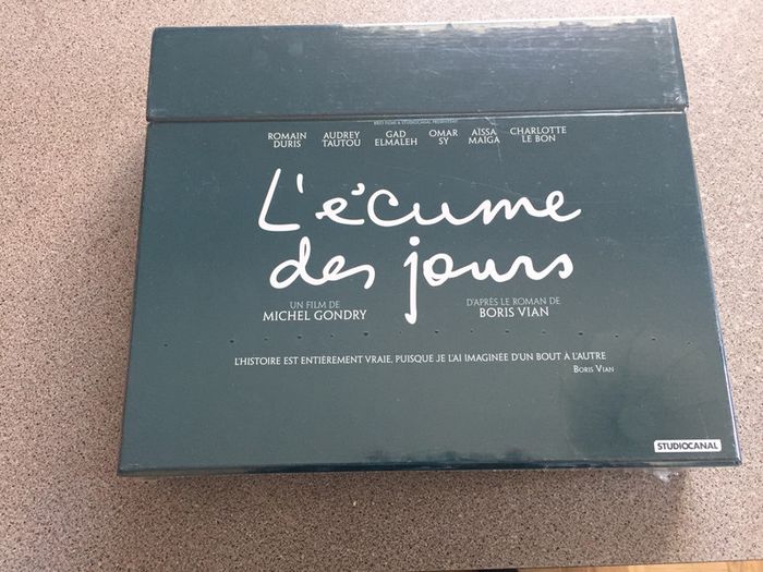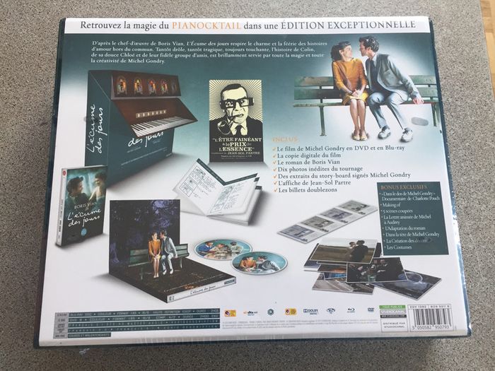 Coffret Neuf L’écume des jours Édition Exceptionnelle Neuf sous Blister Inclus: Le film de Michel Gondry en DVD et en BLU-RAY La copie digitale du film Le roman de Boris Vian Dix photos inédites du tournage Des extraits du story board signés Michel Gondry L’affiche de Jean Sol Partre Les billets doublezons Des Bonus Exclusifs