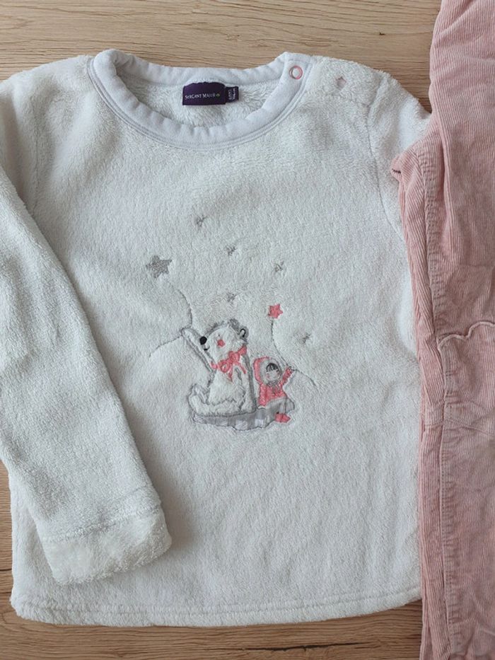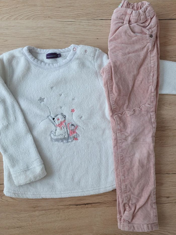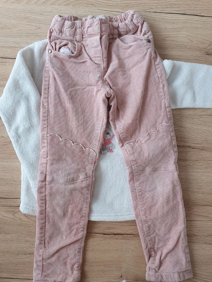 Pull tout doux et pantalon velours doublé Un bouton décoratif était présent sur le pantalon mais s était cassé,j'ai fait le choix de le retirer pour éviter de se blesser En excellent état #papillon761_fille6ans