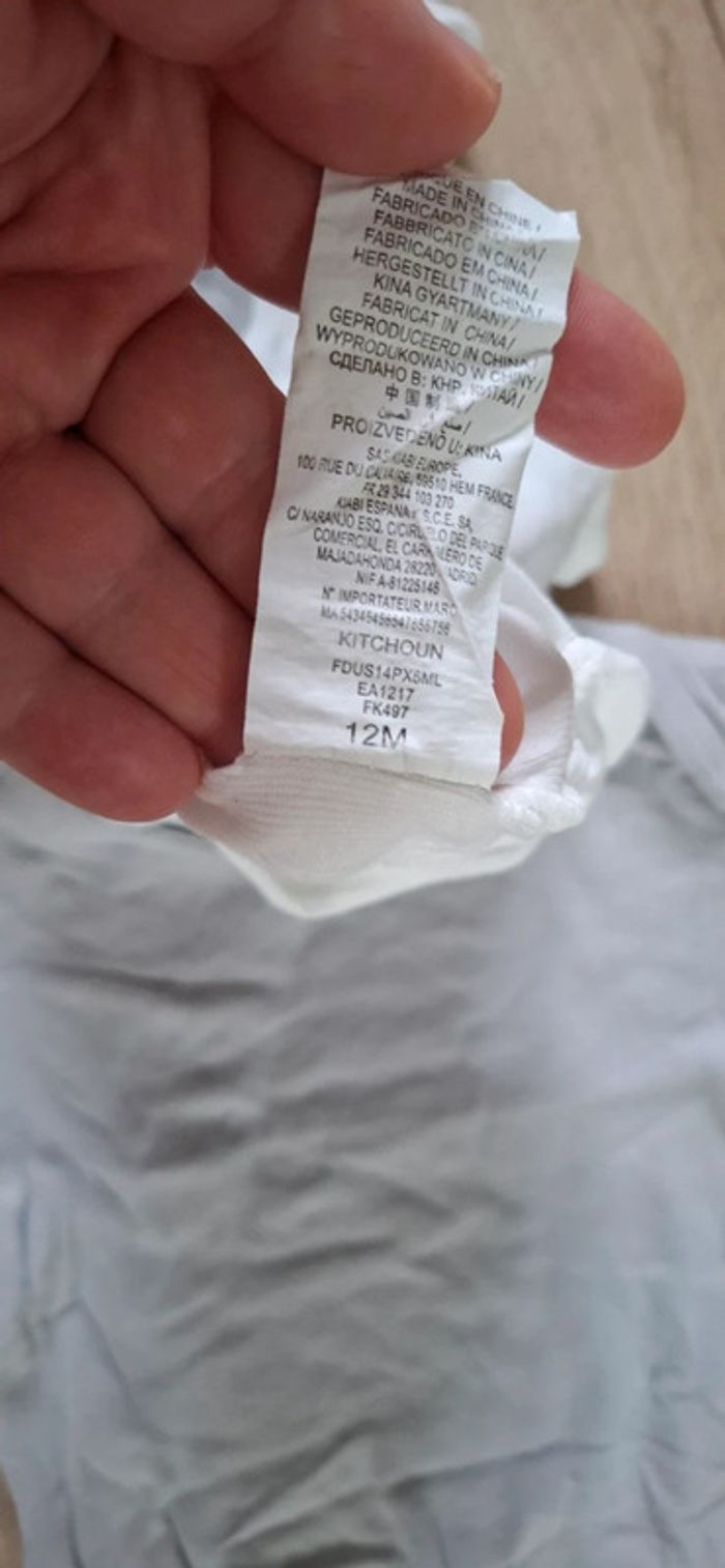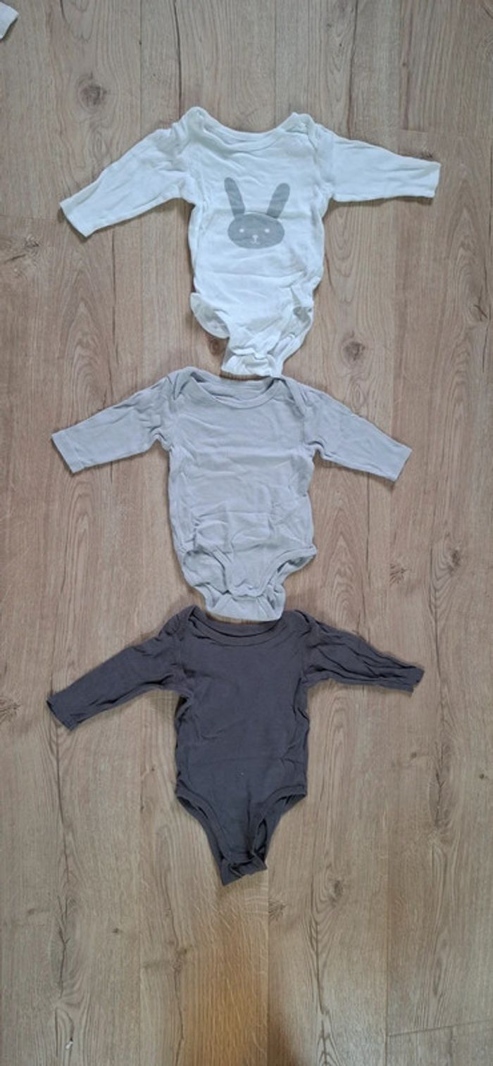 #loluxiagarcon12mois Lot de 3 bodys à manches longues, 12mois / 74cm, Kitchoun de Kiabi, 2 pressions entrejambes 1 uni gris clair, 1 blanc avec impression decor lapin et 1 uni gris foncé (1 petit trou entrejambe cf photo)