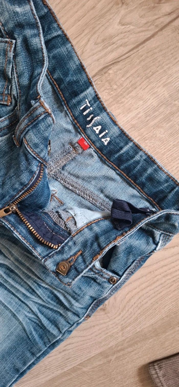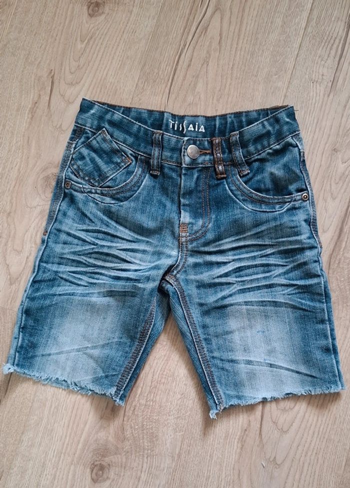 #loluxiagarcon5ans Lot de 2 shorts de marque Tissaia : - 1 marron BE, trace d’usage classique, pas de trou ni tache - 1 jean bleu, effet vieilli troué. Tâches de stylo bleu sur tissus bleu, cuisse gauche