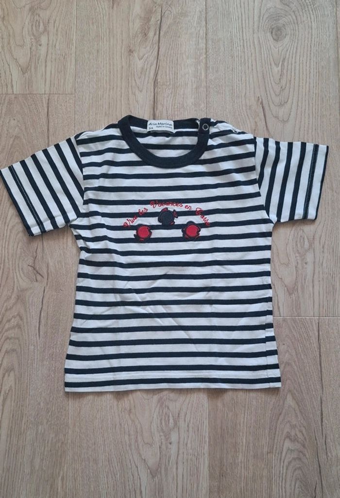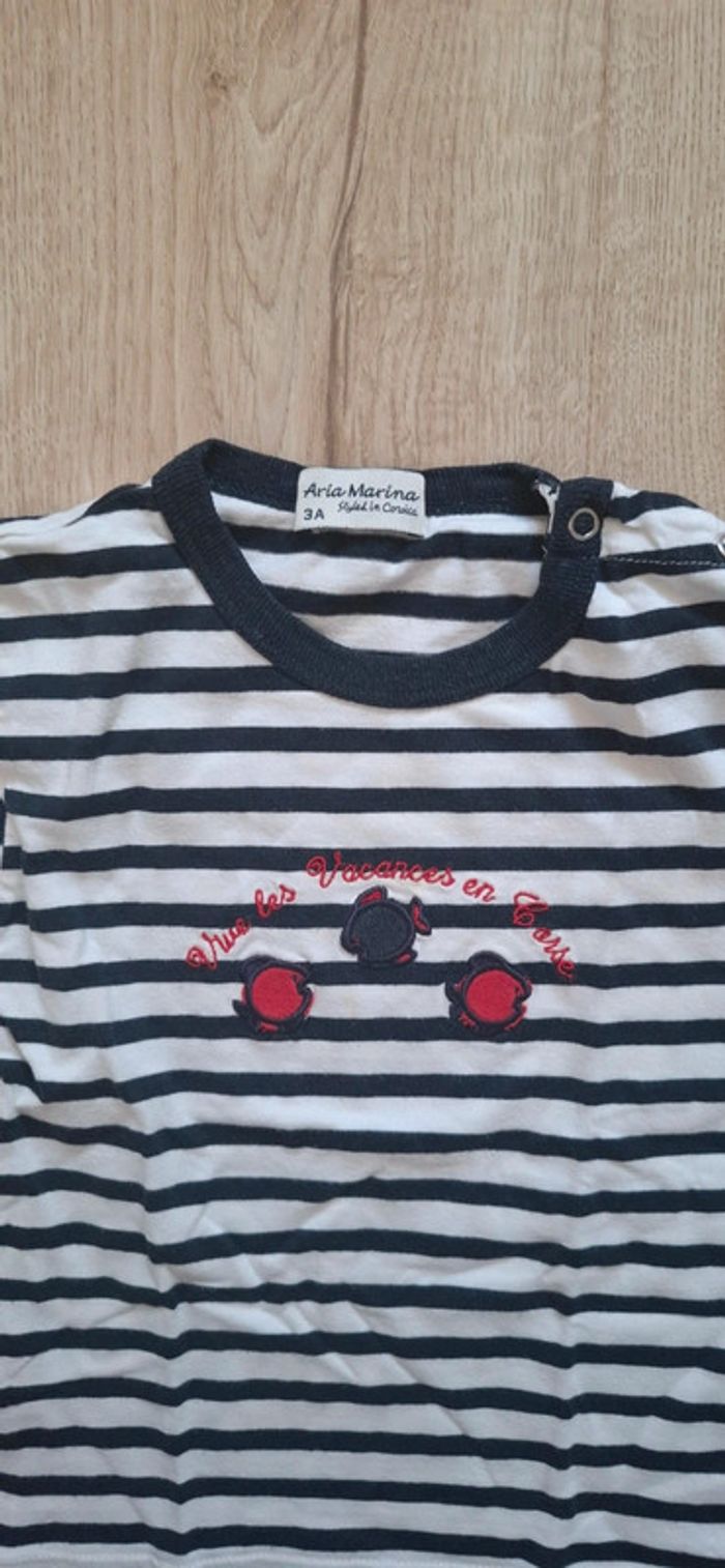 - 1 crème à rayures bleues marines, TBE type marinière, 3ans Aria Marina, broderie "Vive les vacances en Corse", taille plus près du corps, moins large.