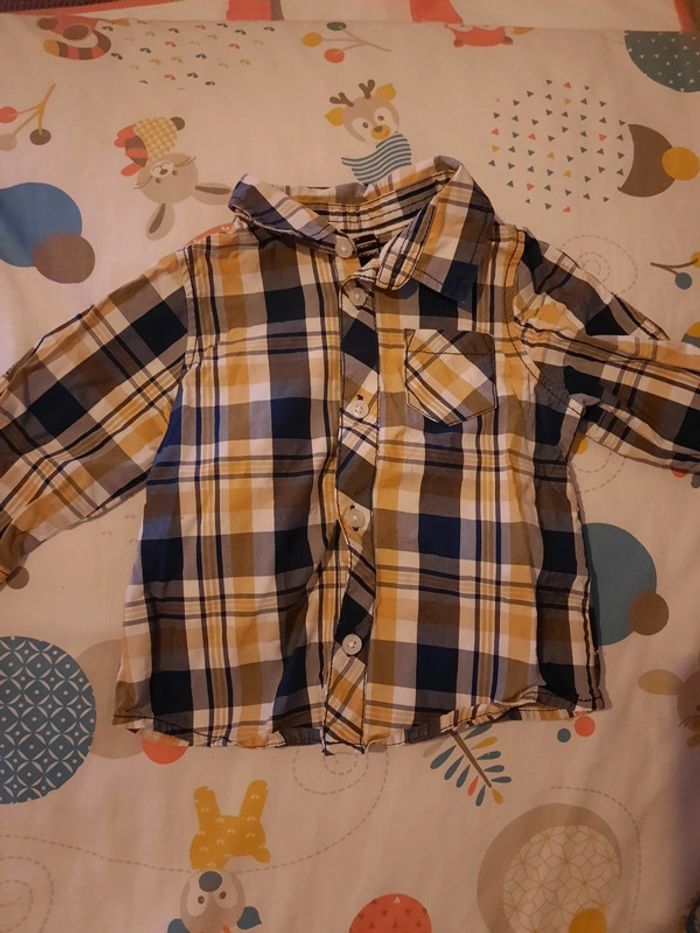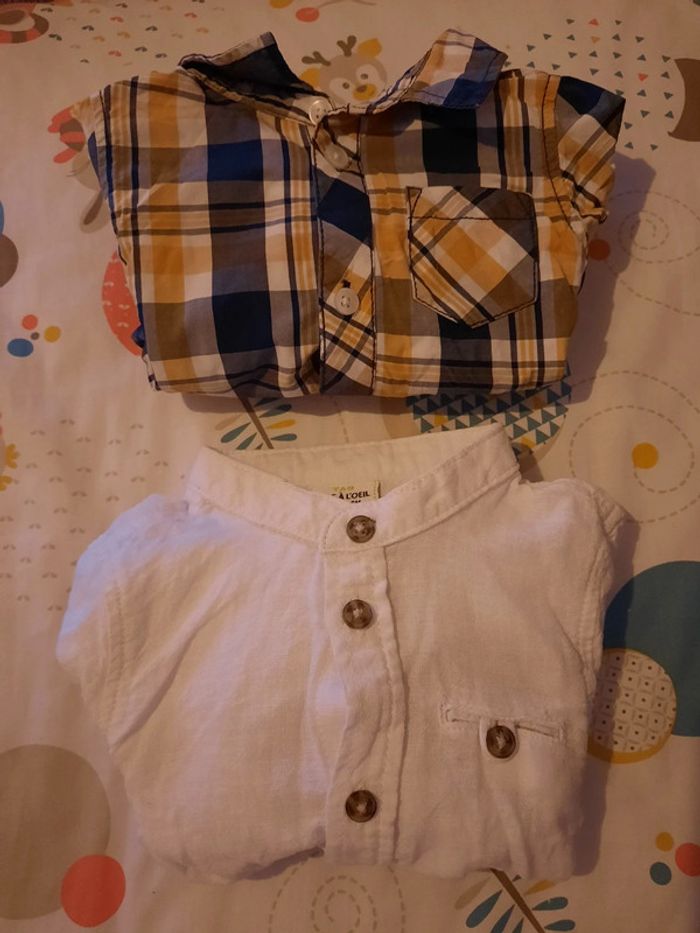 》1 chemise à carreaux bleu et jaune manches longues avec une petite poche 》1 chemise blanche à manches longues avec fausse poche Le tout en très bon état. Peu porté. Taille 6 mois.