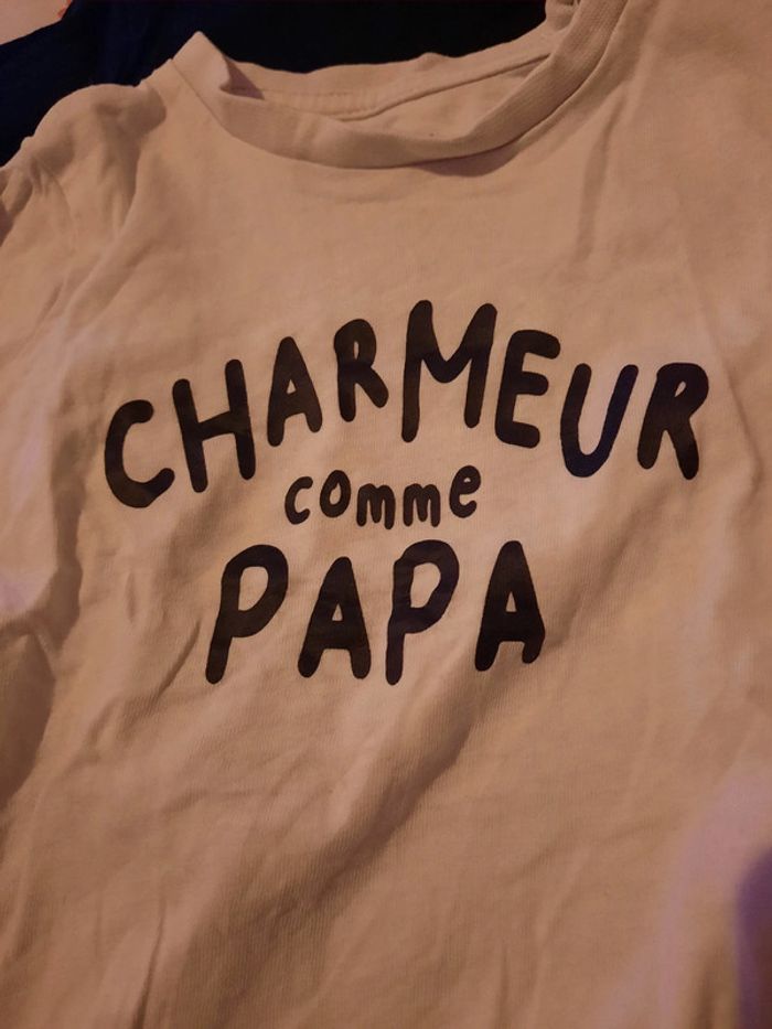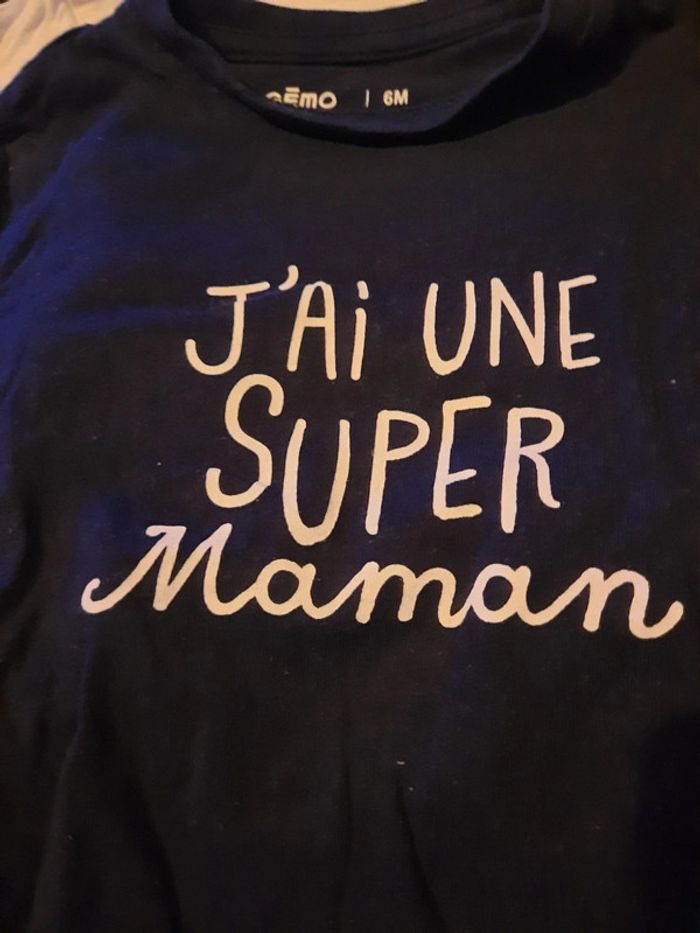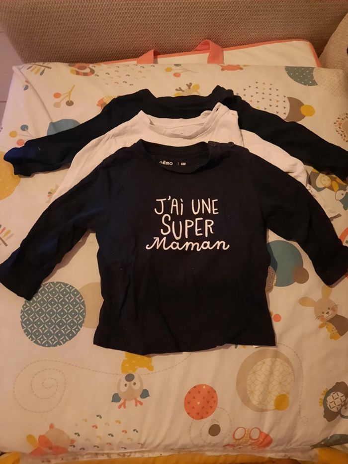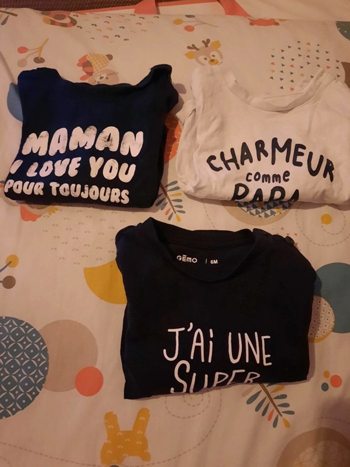 》1 maillot à manches longues bleu marine "maman i love you pour toujours" avec ouverture au niveau de l'épaule. Neuf jamais porté. 》1 maillot à manches longues blanc "charmeur comme papa" avec ouverture au niveau de l'épaule. 》1 maillot à manches longues bleu marine " j'ai une super maman" avec ouverture au niveau de l'épaule Le tout en très bon état. Très peu porté. Taille 6 mois
