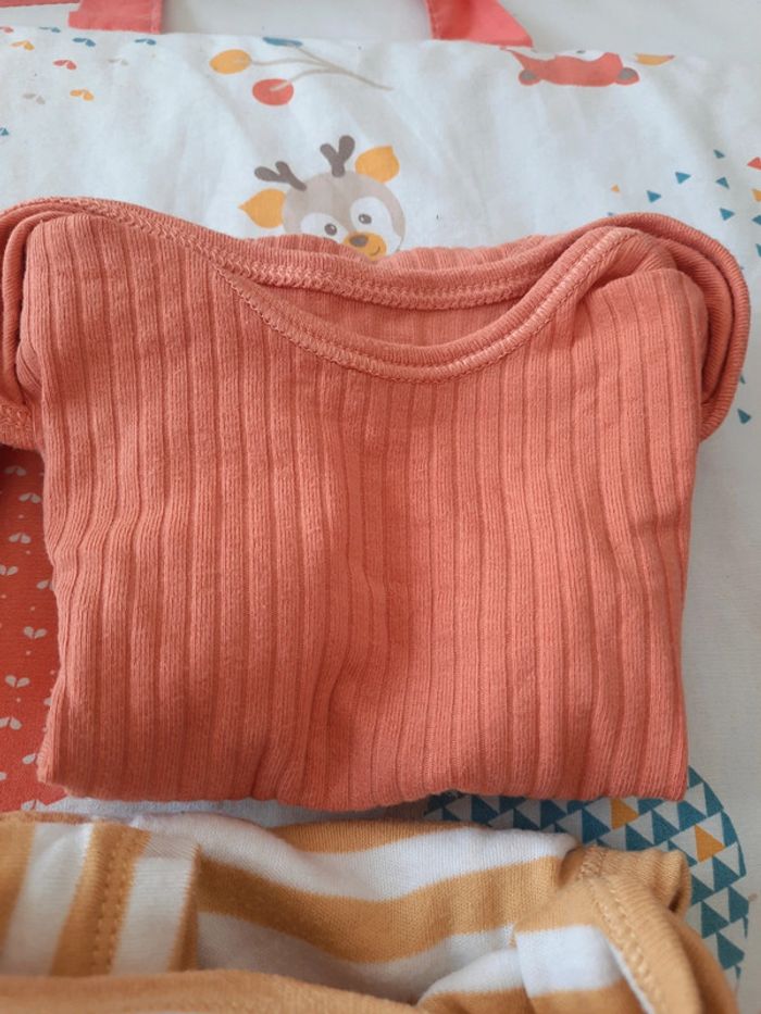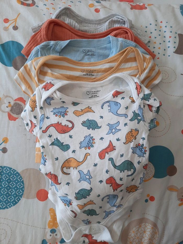 》1 body uni gris à manches courtes 》1 body uni orange à manches courtes 》1 body bleu imprimés animaux à manches courtes avec ouverture sur le côté 》1 body à rayures jaune et blanc à manches courtes 》1 body imprimés dinausaures à manches courtes Le tout en très bon état. Très peu porté. Taille 6 mois