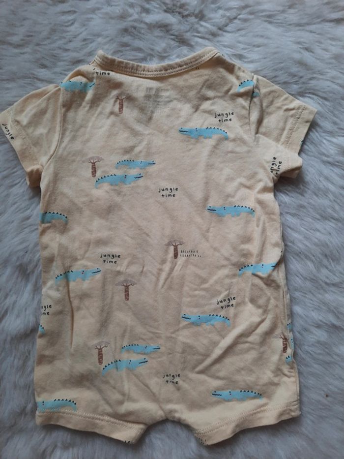 Combishort crocodile en très bon état. Porté 2/3 fois donc proche du neuf. Taille 1 mois. Ouverture sur le côté.