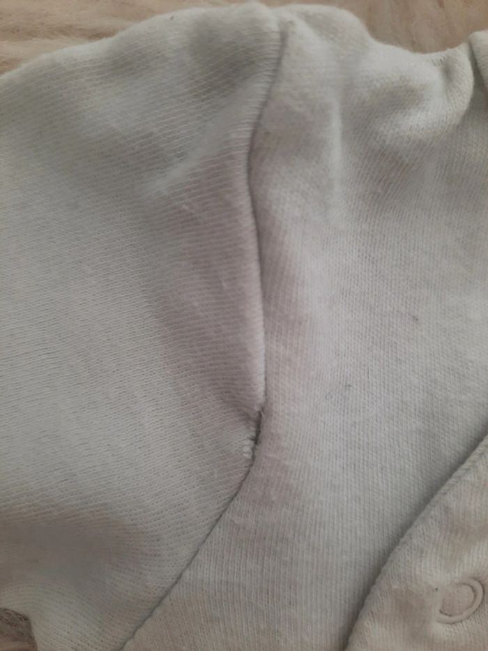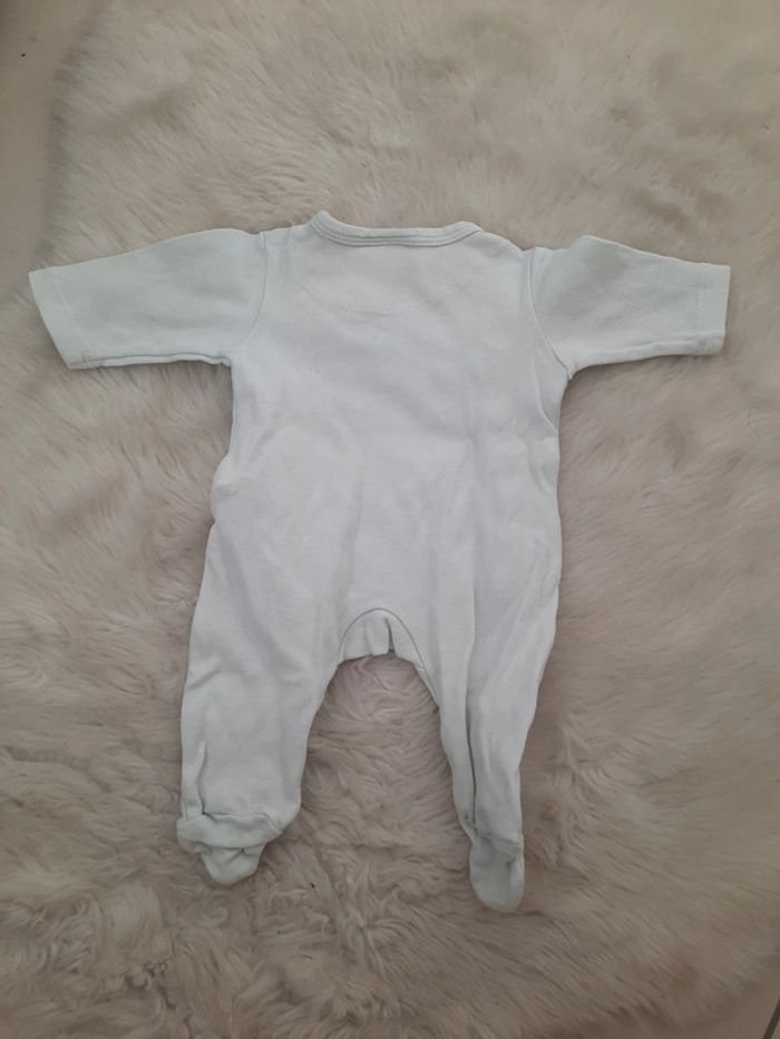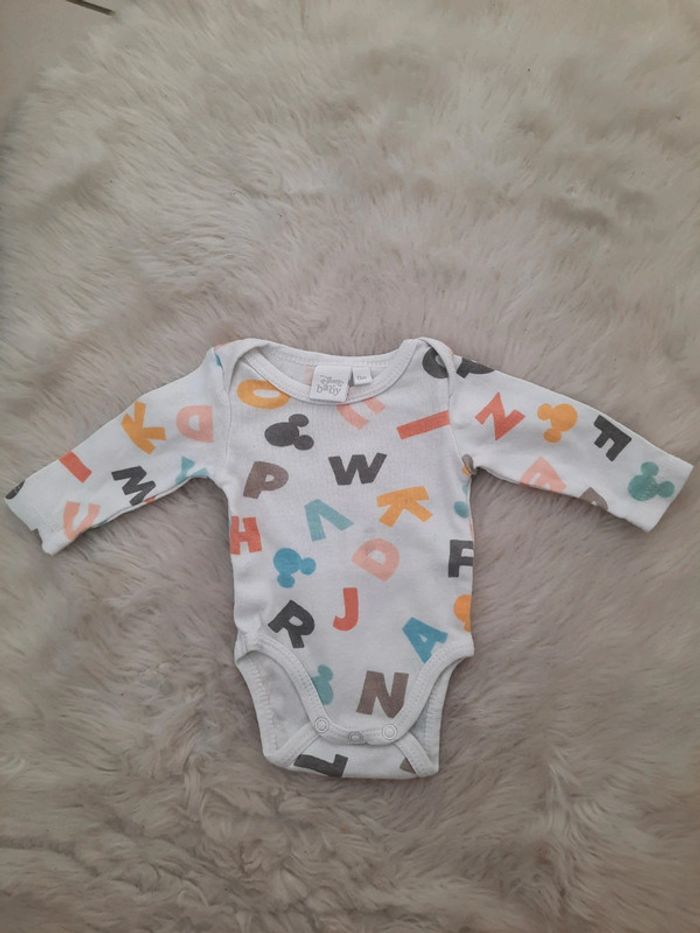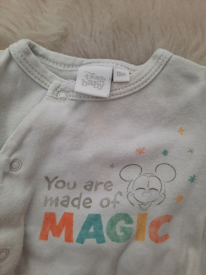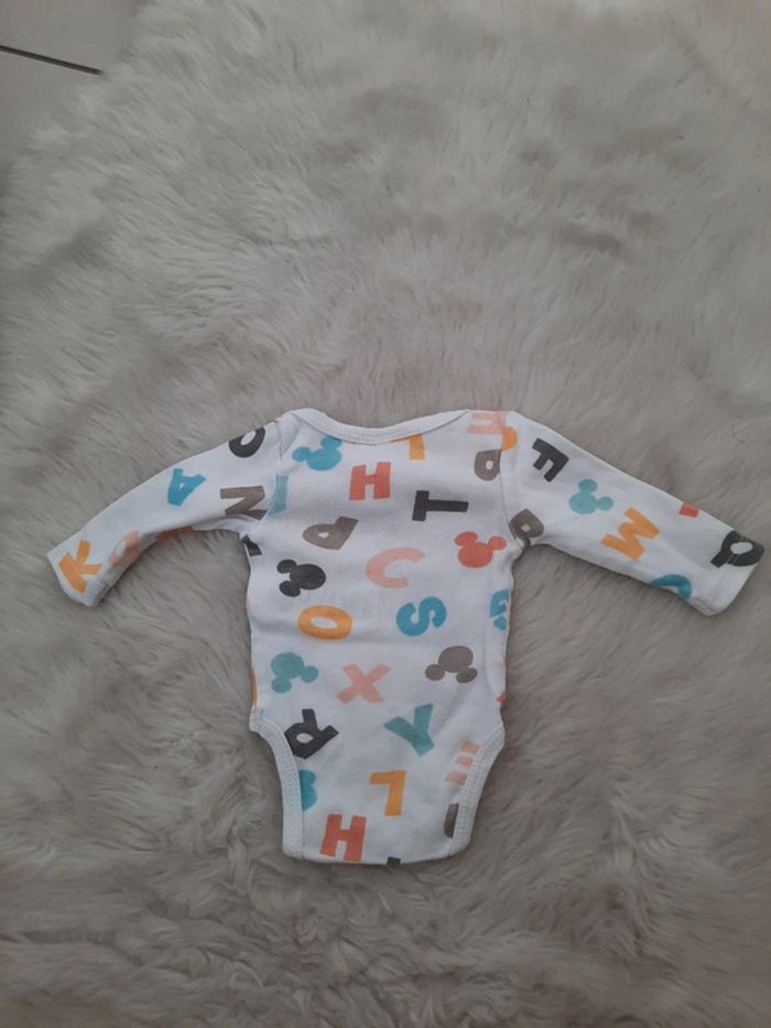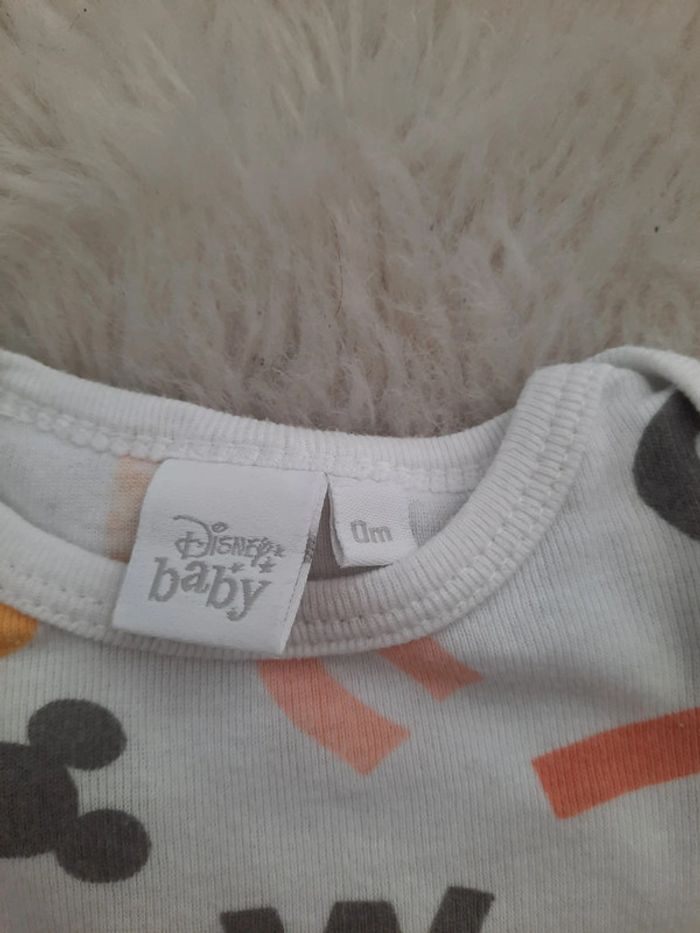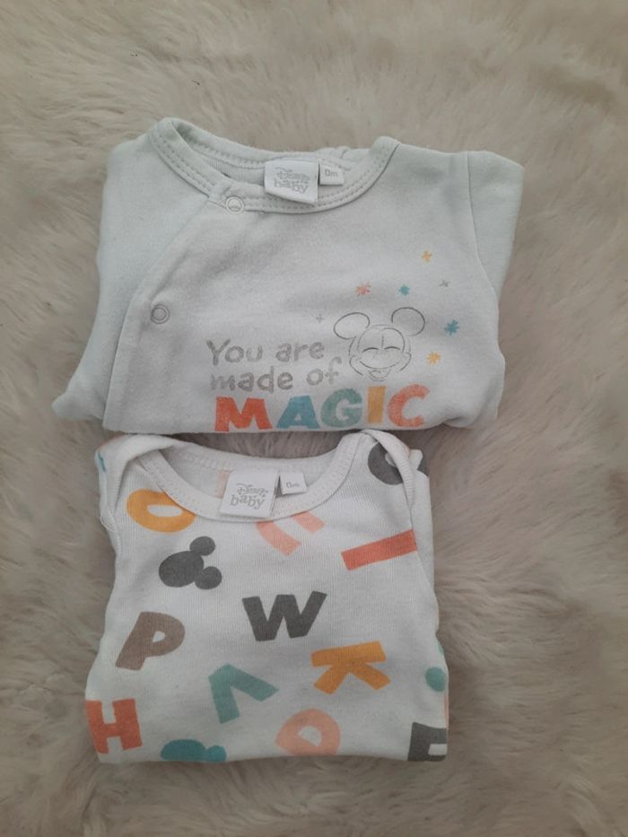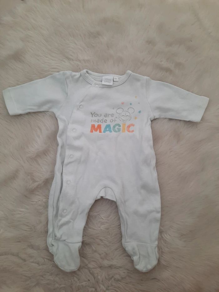 Ensemble bodie et pyjama Mickey taille naissance. Ouverture sur le côté pour le pyjama. Petit trou au niveau de l'épaule mais rien de méchant (voir photo). Porté quelques fois