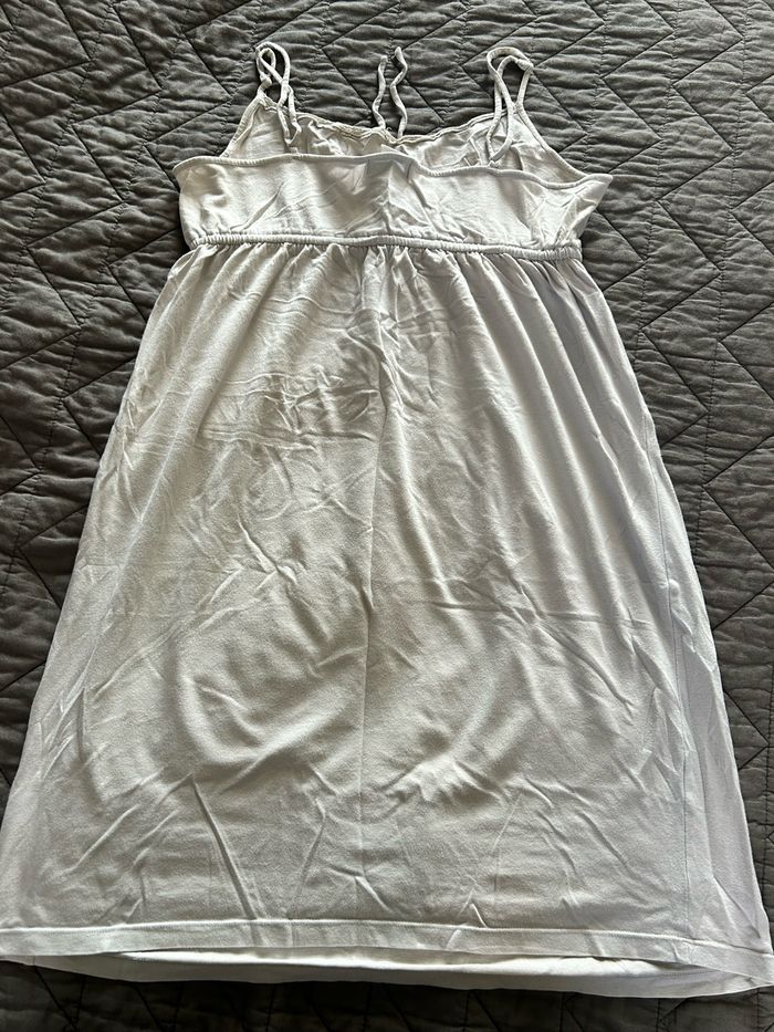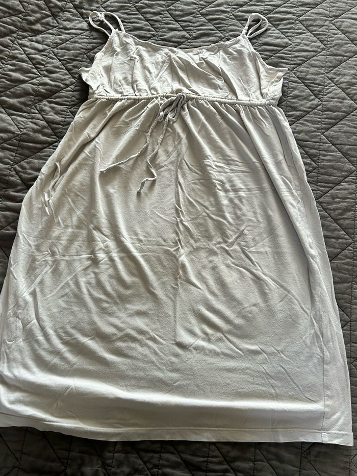 Chemise de nuit à bretelles fines spécial grossesse. Ample au niveau du ventre et poitrine. Couleur gris clair. Taille 38/40 de la marque « Vertbaudet ». À été portée mais encore en très bon état.
