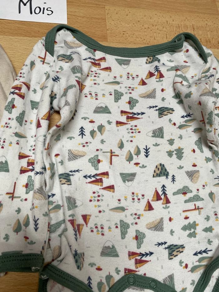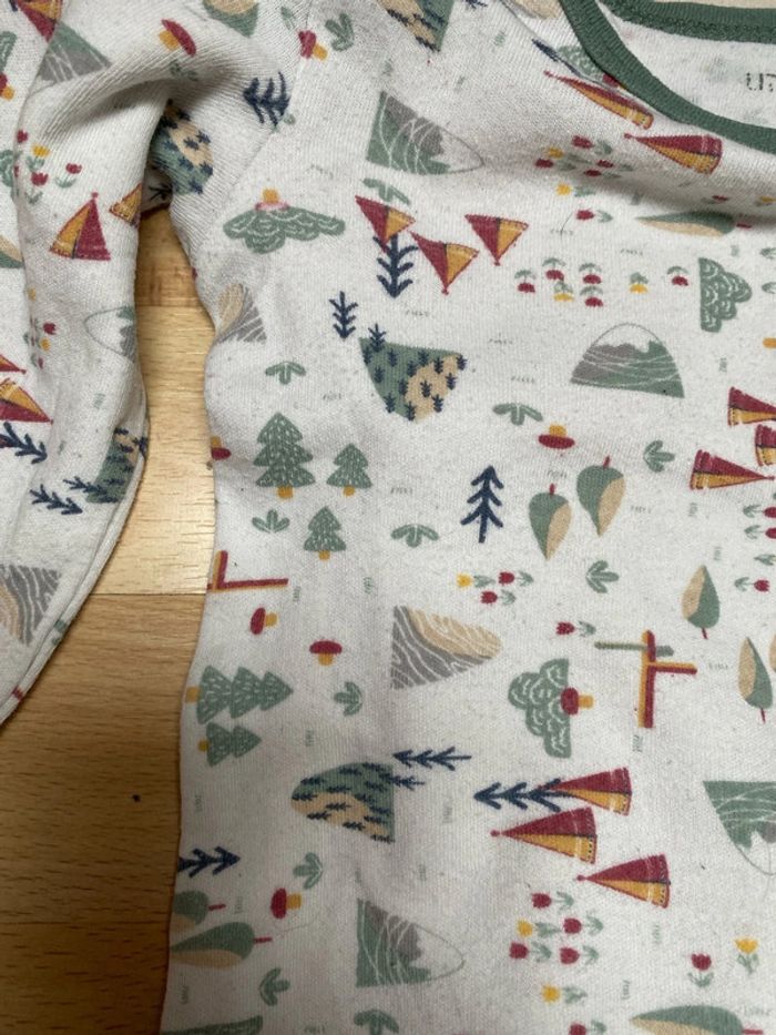 Lot 3 bodies manches longues 24 mois Différentes marques 2 Little Camper 1 Kiabi Ecoconception TBE général Bouloches sur le body Little Camper avec sapins (photo)